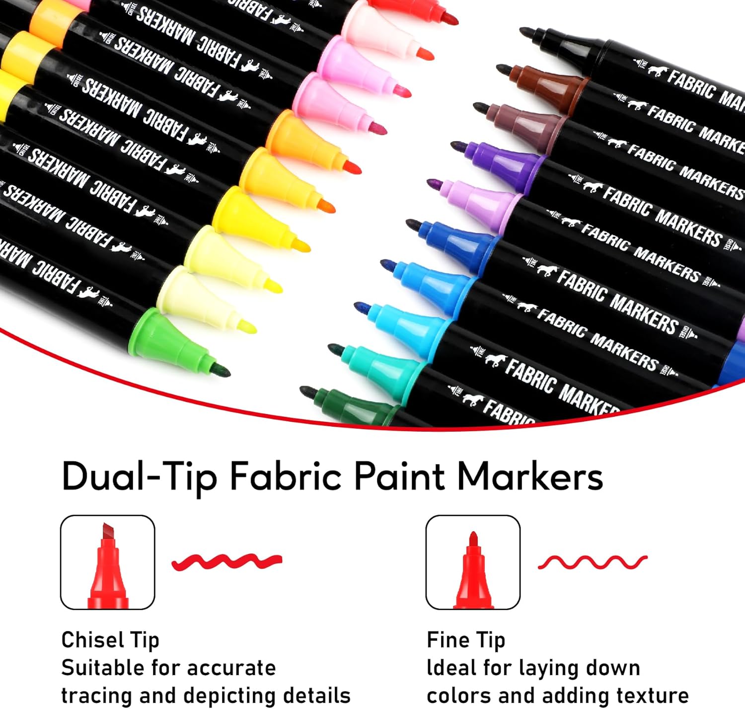 - 【Innovative Dual-Tip Design】Unleash your creativity with our unique dual-tip fabric markers. The fine tip is perfect for intricate details, while the chisel tip is ideal for broad areas of coloring. From delicate lines to smooth shading, these markers effortlessly cater to your artistic needs.