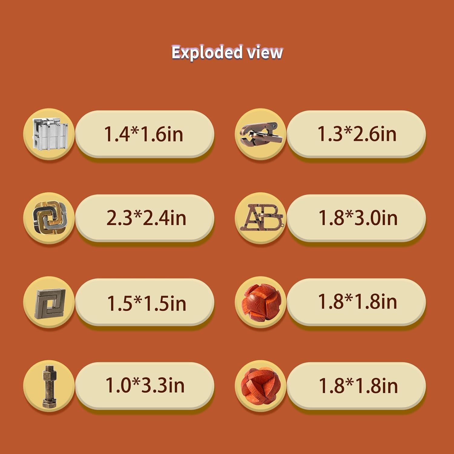 8 Pcs Brain Teaser Puzzles Favor Educational Toys Mind Puzzles Ancient Wooden and Metal 3D Unlock Interlock IQ Puzzles Box Game
