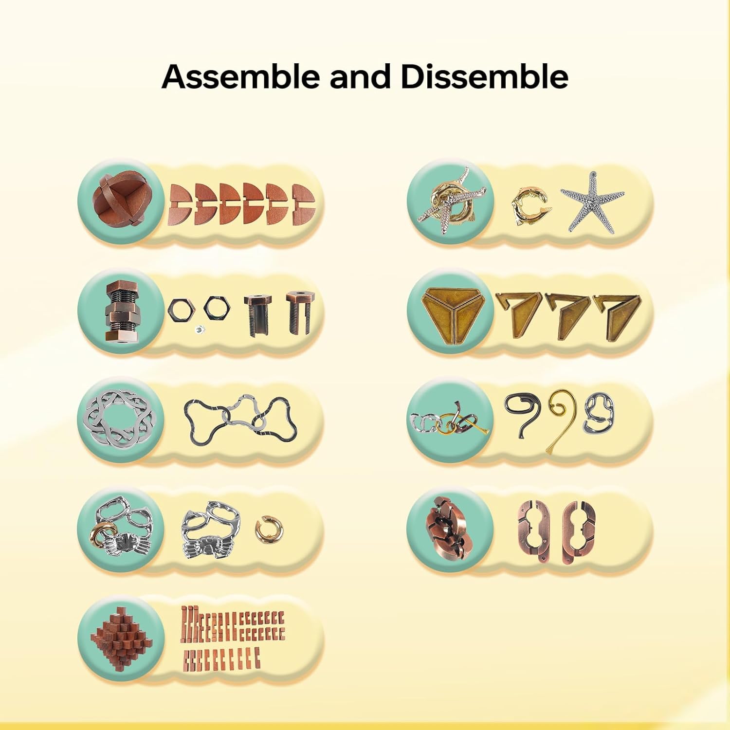 - [BRAIN TEASER PUZZLES ADULTS, TEENS, AND KIDS] Zinc alloy 3D metal puzzles and wooden puzzles are smooth for brain game, puzzles set do not easily bend or break even when thrown or stepped on. Assembly puzzles and disentanglement puzzles are a healthier way to passing time, practice focus and concentration, get them as an IQ test challenge game in limited time, bring lots of Logical fun.