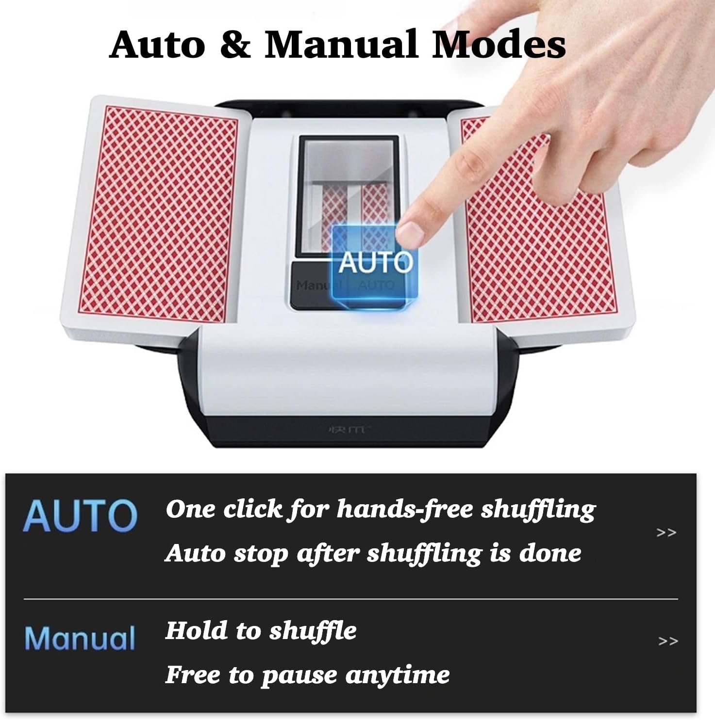 - One Press: Skip bo UNO card shuffler offers two modes - Auto & Manual, with one button for automatic hands-free shuffling, and the other button allowing free shuffling and pause anytime