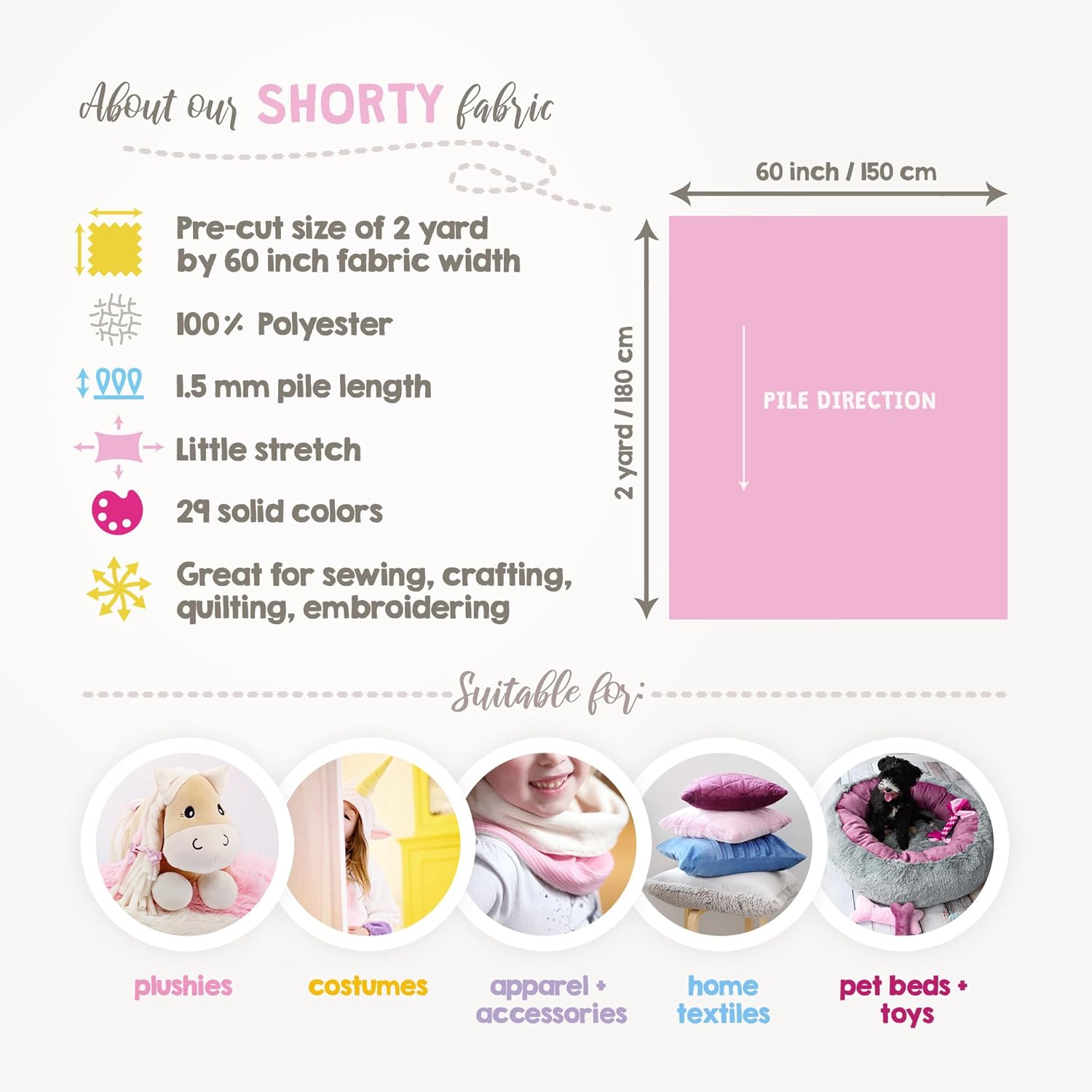 - High-quality plush material: Pre-cut, slightly stretchy minky fabric made from 100% polyester microfiber with a size of 2 yard by 60 inch fabric width (180Γ150 cm). Our durable & easy-to-sew plush fabric retains its comfort, softness and vibrant color even after multiple washes, ensuring long-lasting quality.