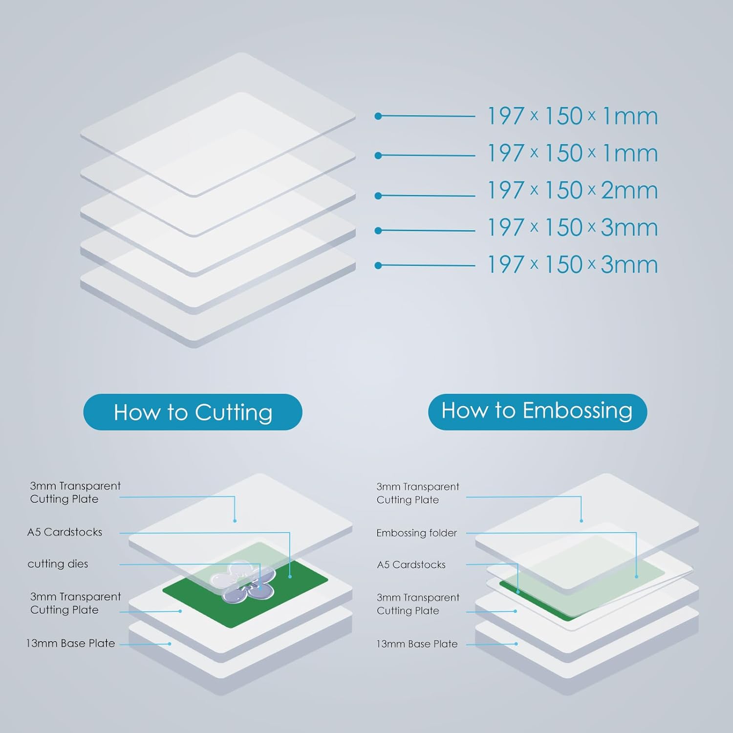 - How to Embossing with ArtiRuum Manual Die Cutting Machine:1pc 13mm plate+2pcs 3mm PC plate+embossing folder with paper inside.