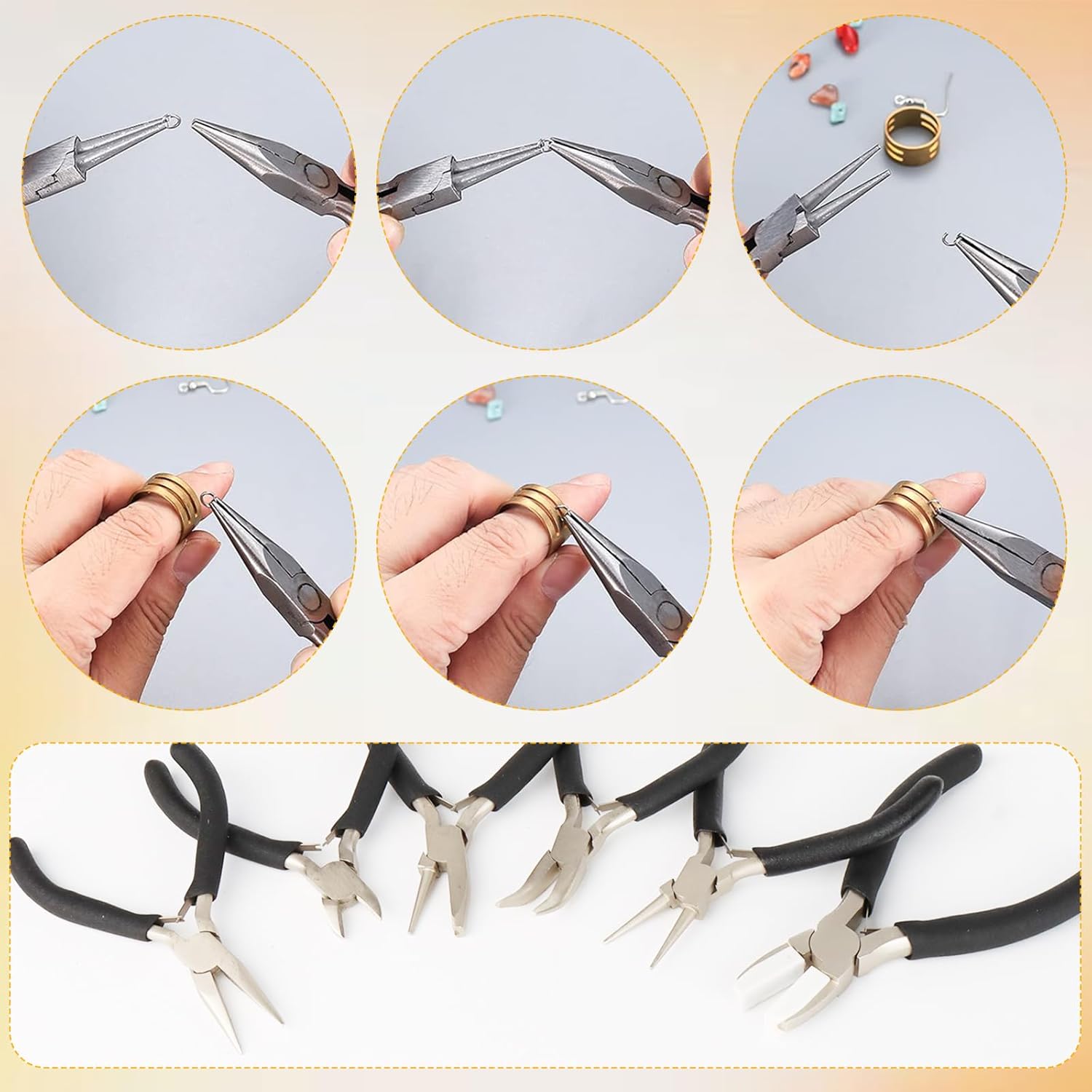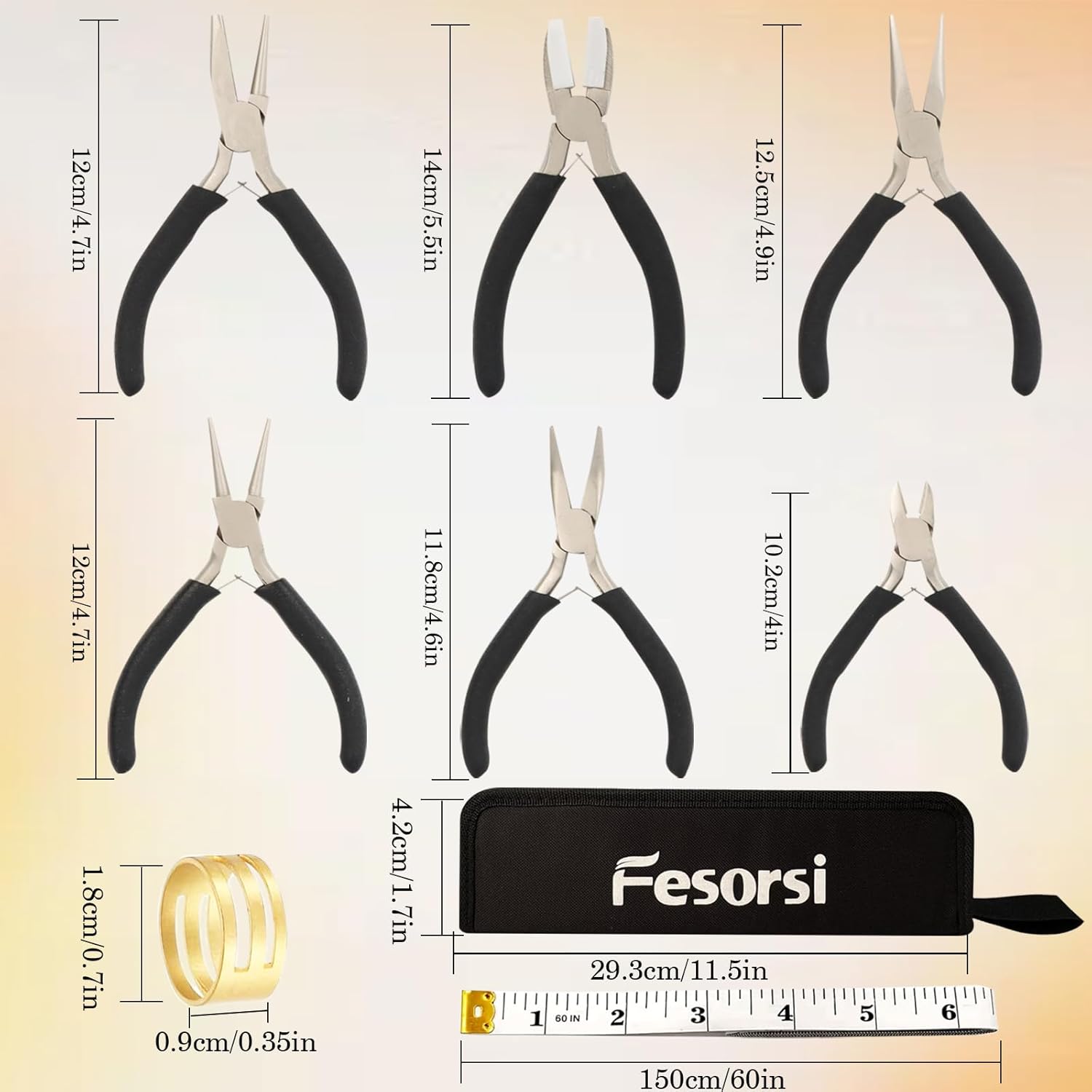 - Packaging details: This jewelry pliers kit includes 6 pieces of jewelry pliers - which include: round nose pliers, needle nose pliers, wire cutters, nylon jaw pliers, bent nose pliers, wire looping pliers, and also comes with cloth measuring ruler, a jump ring and a storage bag