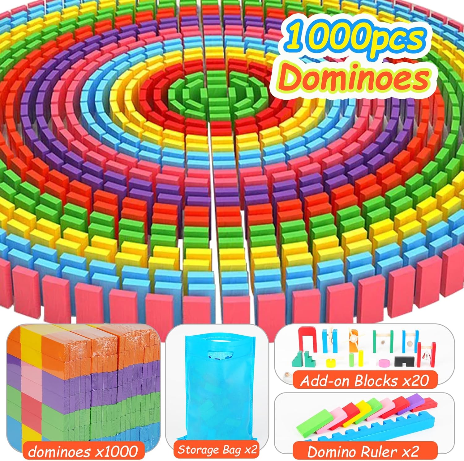 1000 Piece Dominoes Set for Kids with Extra 20 Blocks, Colorful Dominos Tiles for Building, Stacking, Racing, Tumbling, Wood Domino with Storage Bag and Box
