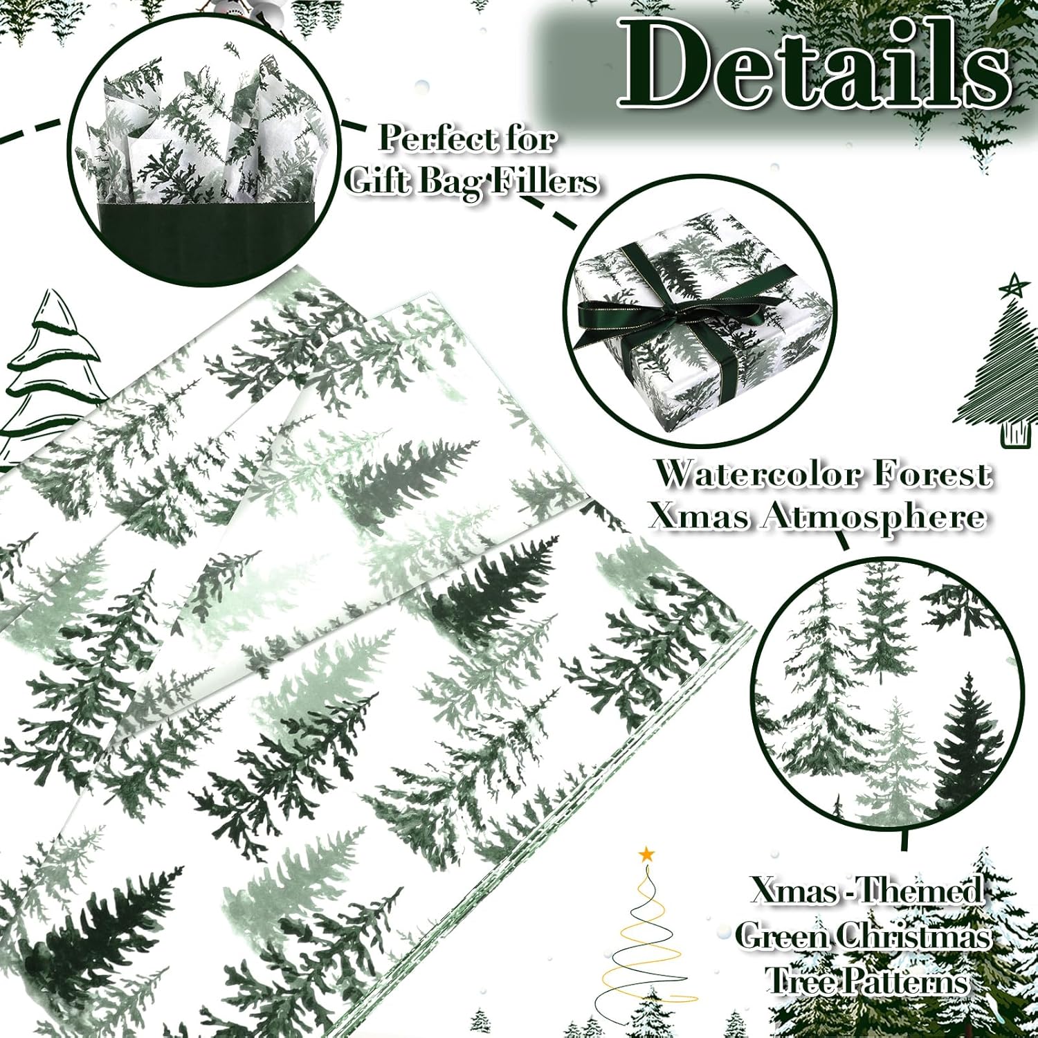 - 🎄🎁🎄【VARIOUS APPLICATIONS】: Our watercolor Christmas tree wrapping paper can be used as gift wrapping material or gift bag filler, and is also suitable for Baby Shower, Valentines Day, Mother's Day, weddings, baby christenings, birthdays, Spring party, Boho Herb party, jungle themed parties and other occasions, adding a very refreshing and delightful scent.