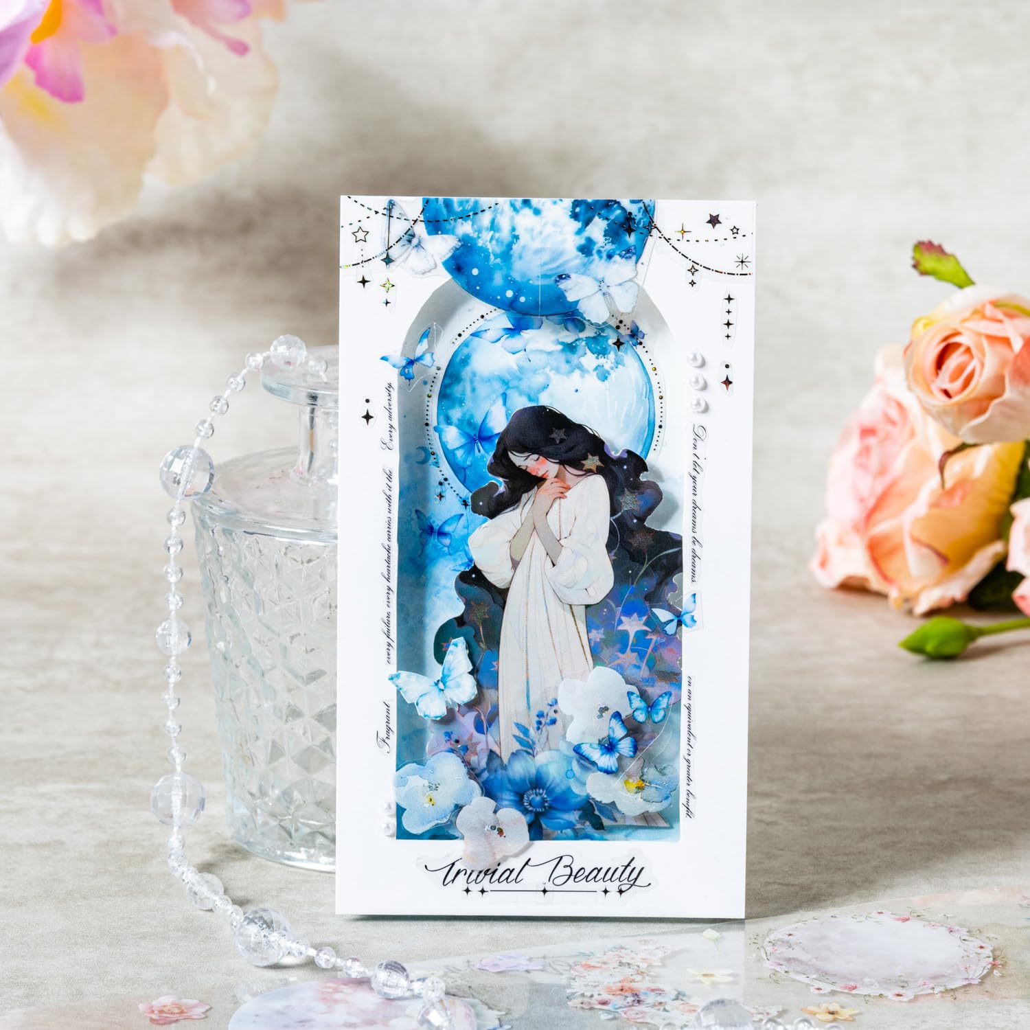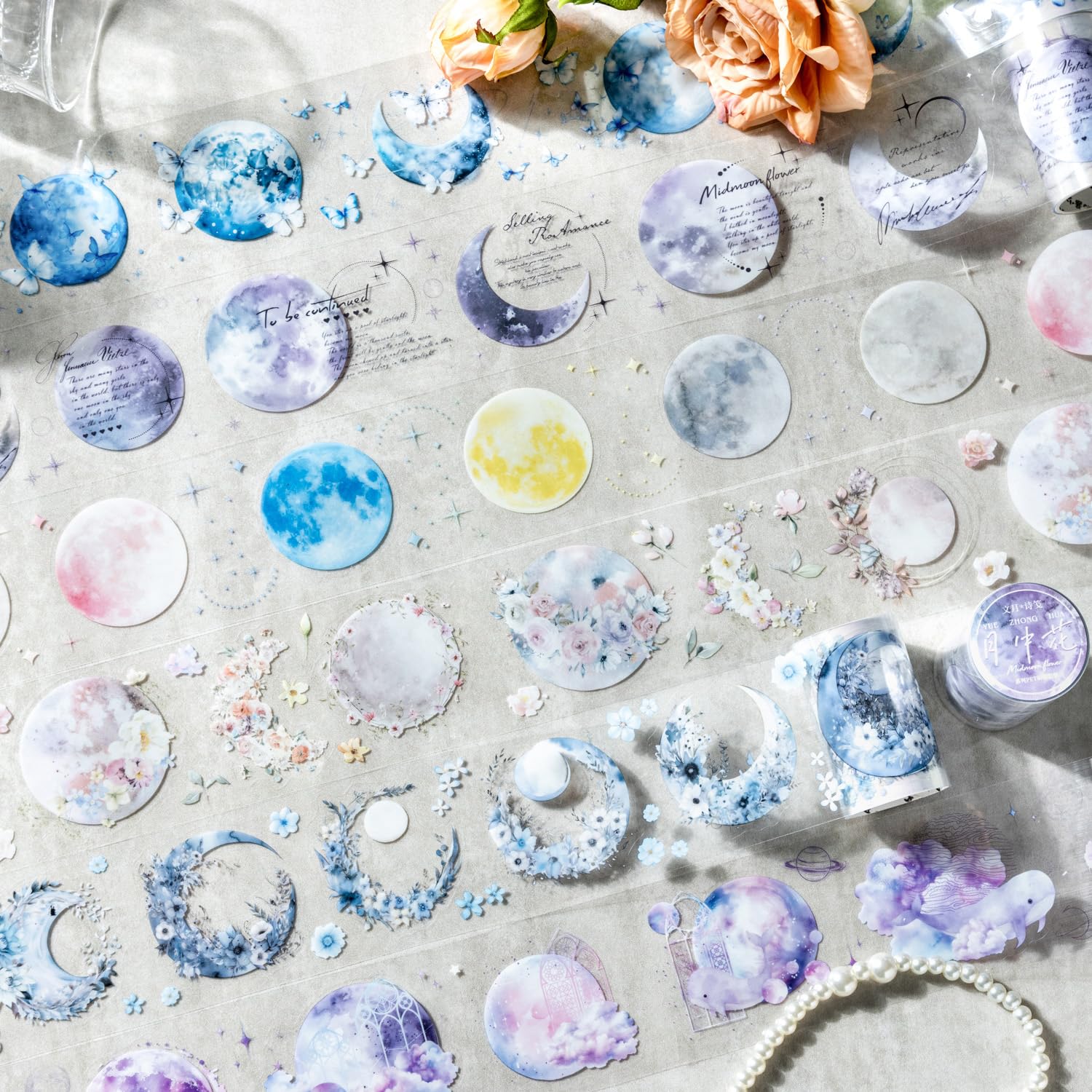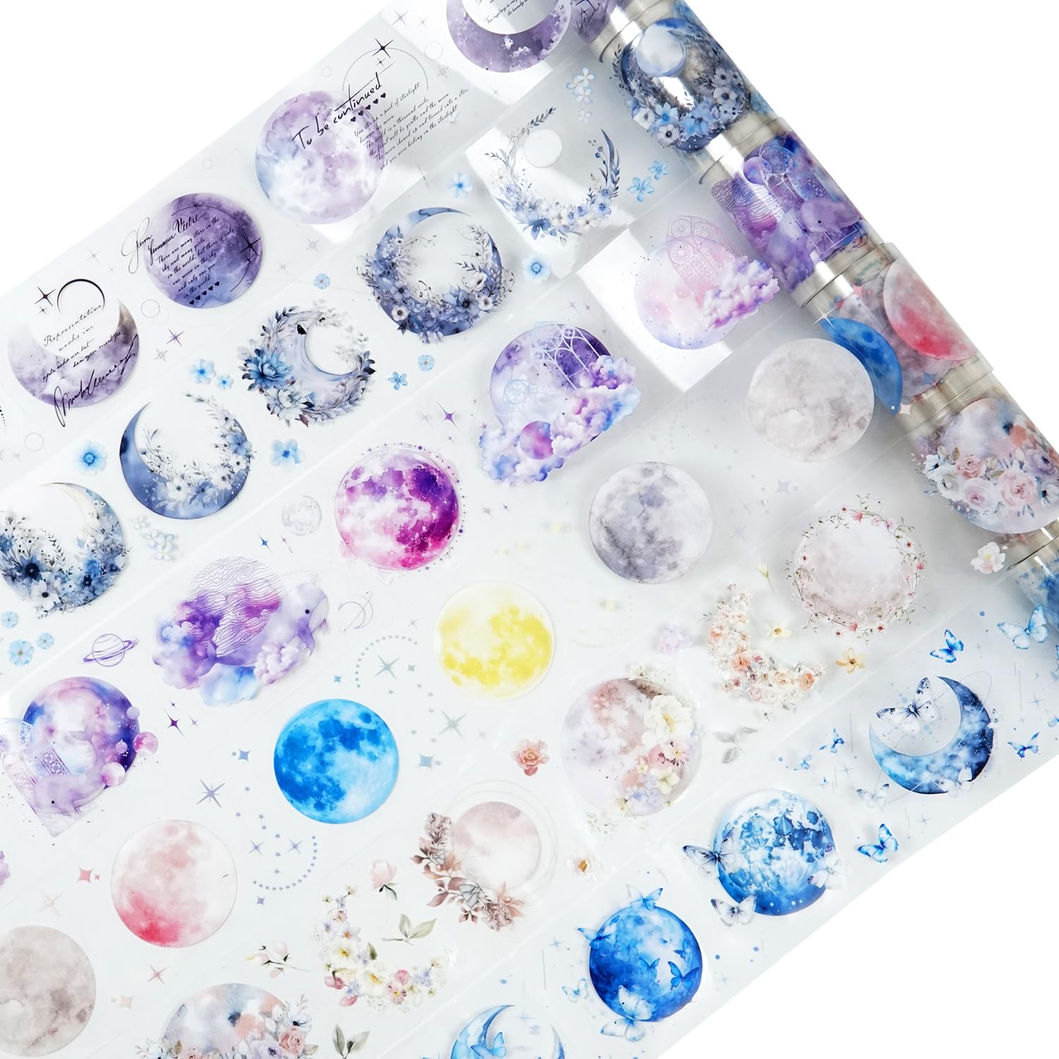 - Captivating Moon & Floral PET Design: Each roll showcases a stunning combination of moon phases, floral elements, and butterflies, ideal for elevating your journaling, scrapbooking, and DIY crafts. The ethereal design adds a magical touch to every project