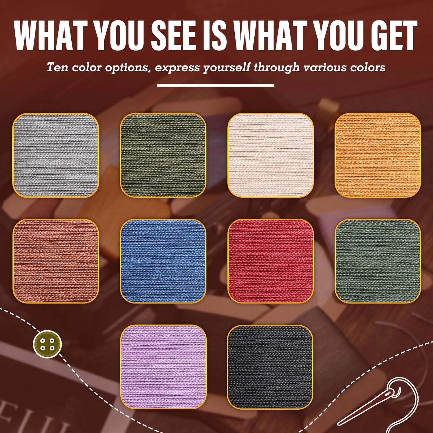 - Round Waxed Thread: Wax thread uses 3 strands of thread, make the thread stronger, waxed thread is not easy to unravel, preventing the stitches from coming loose and ensuring the longevity of the work, wax thread is evenly waxed, which can reduce friction during needle threading and sewing, and improve the smoothness of operation