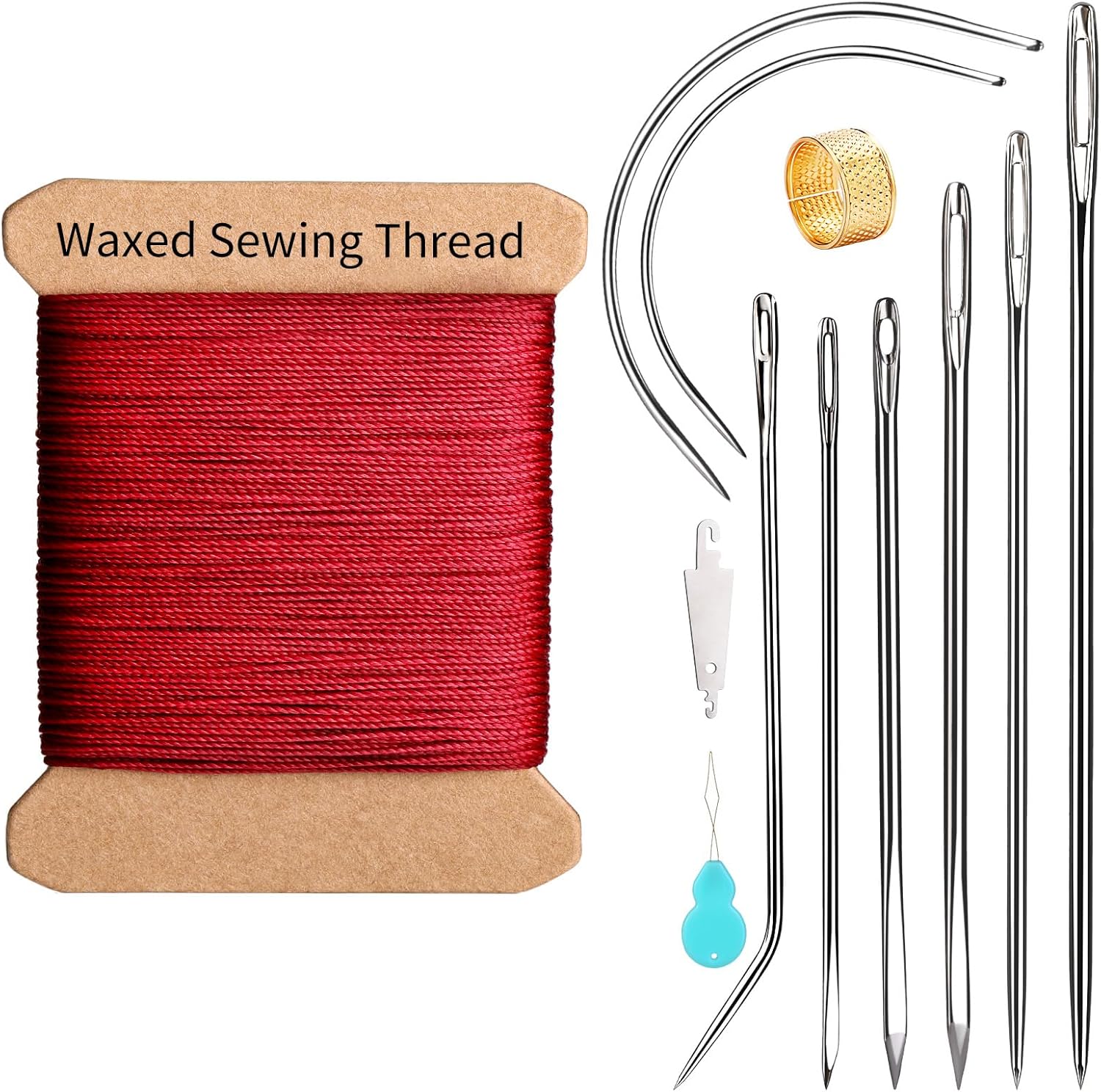 - Leather Needle and Waxed Thread Kit: Upholstery repair kit include 1 rolls 32 yards waxed threads and 8 heavy-duty needles (long upholstery needles, curved needles, j-shaped, triangle leather stitching needle, sail needle), thimbles, threaders. Useful for both beginners and professionals, sufficiently long wax thread and a sufficient number of needles can complete most leather projects