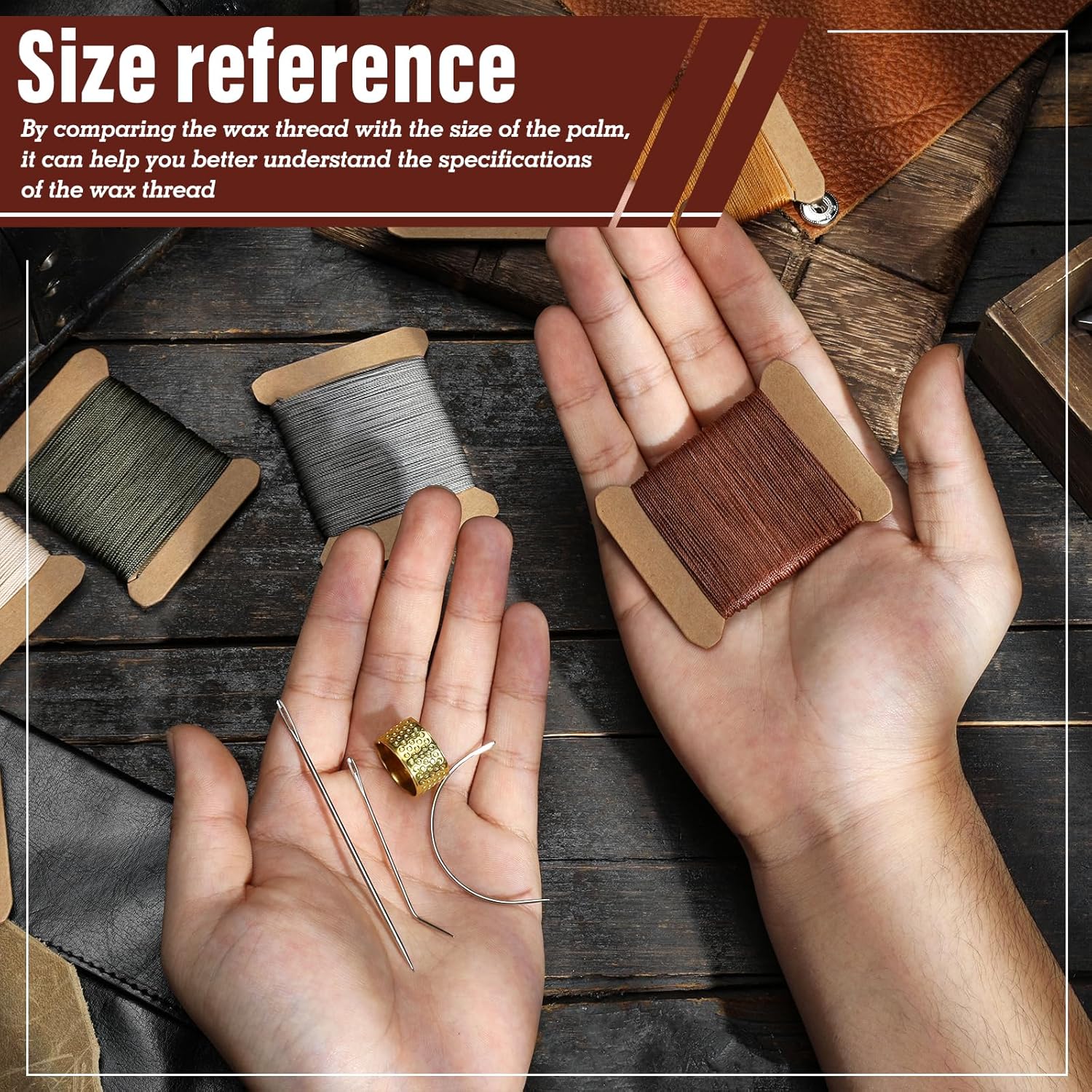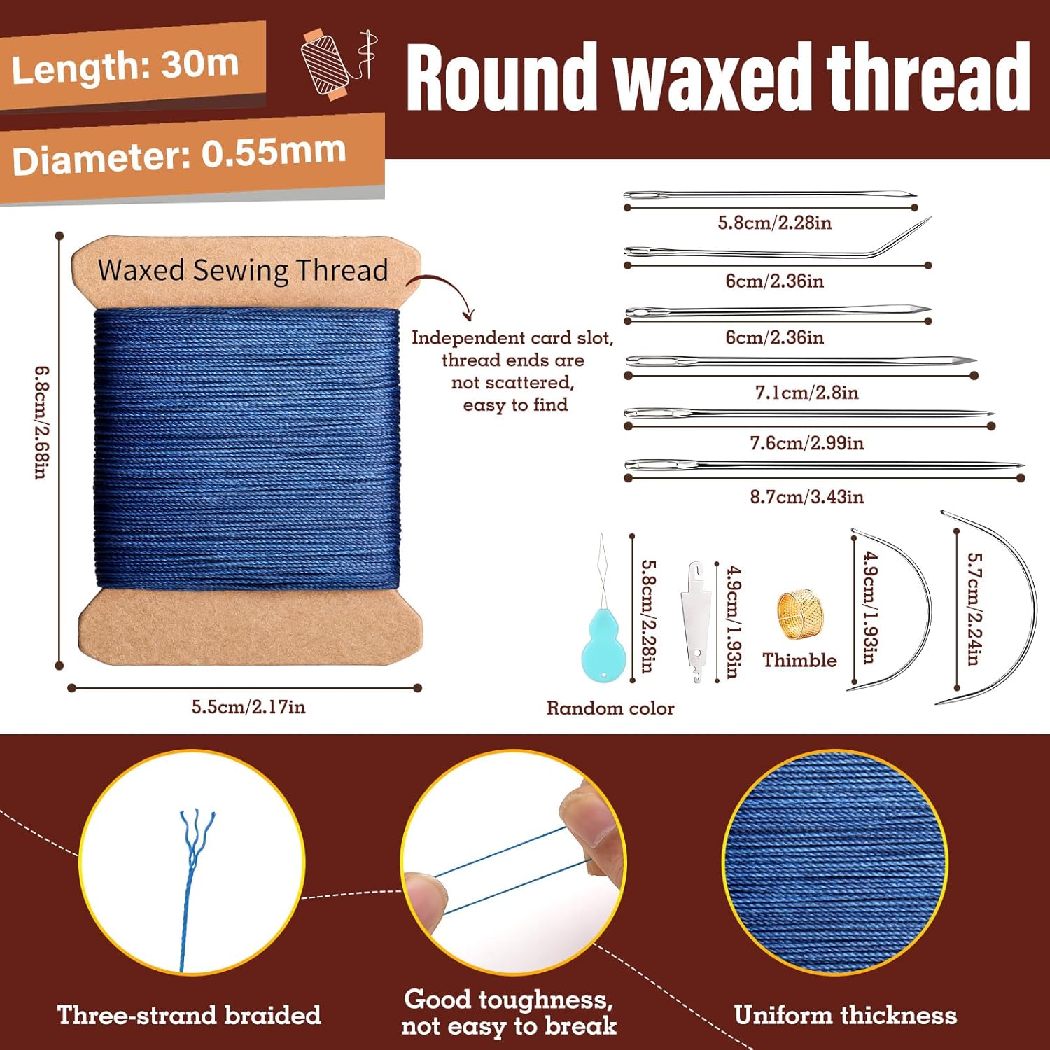 - Round Waxed Thread: Wax thread uses 3 strands of thread, make the thread stronger, waxed thread is not easy to unravel, preventing the stitches from coming loose and ensuring the longevity of the work, wax thread is evenly waxed, which can reduce friction during needle threading and sewing, and improve the smoothness of operation
