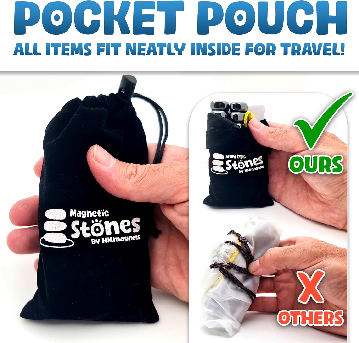 - WHATโS INCLUDED: The magnetic chess game set comes with 20 larger, improved magnetic hematite stones, an adjustable string, 2 dice, instructions and a convenient travel pouch to keep everything organized and portable.