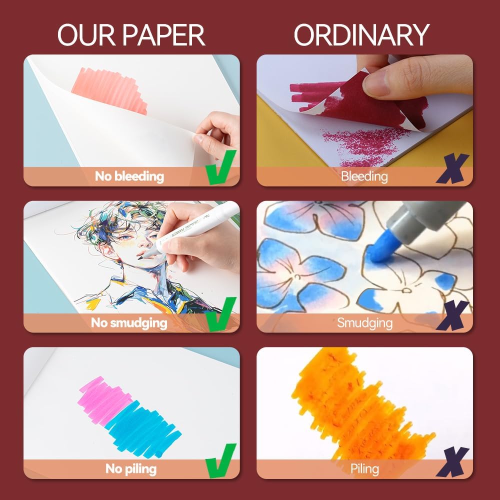 - This pad is versatile, suitable for different medium, support alcohol markers, acrylics markers, watercolors, gouache, inks, pencils and pastels, etc.