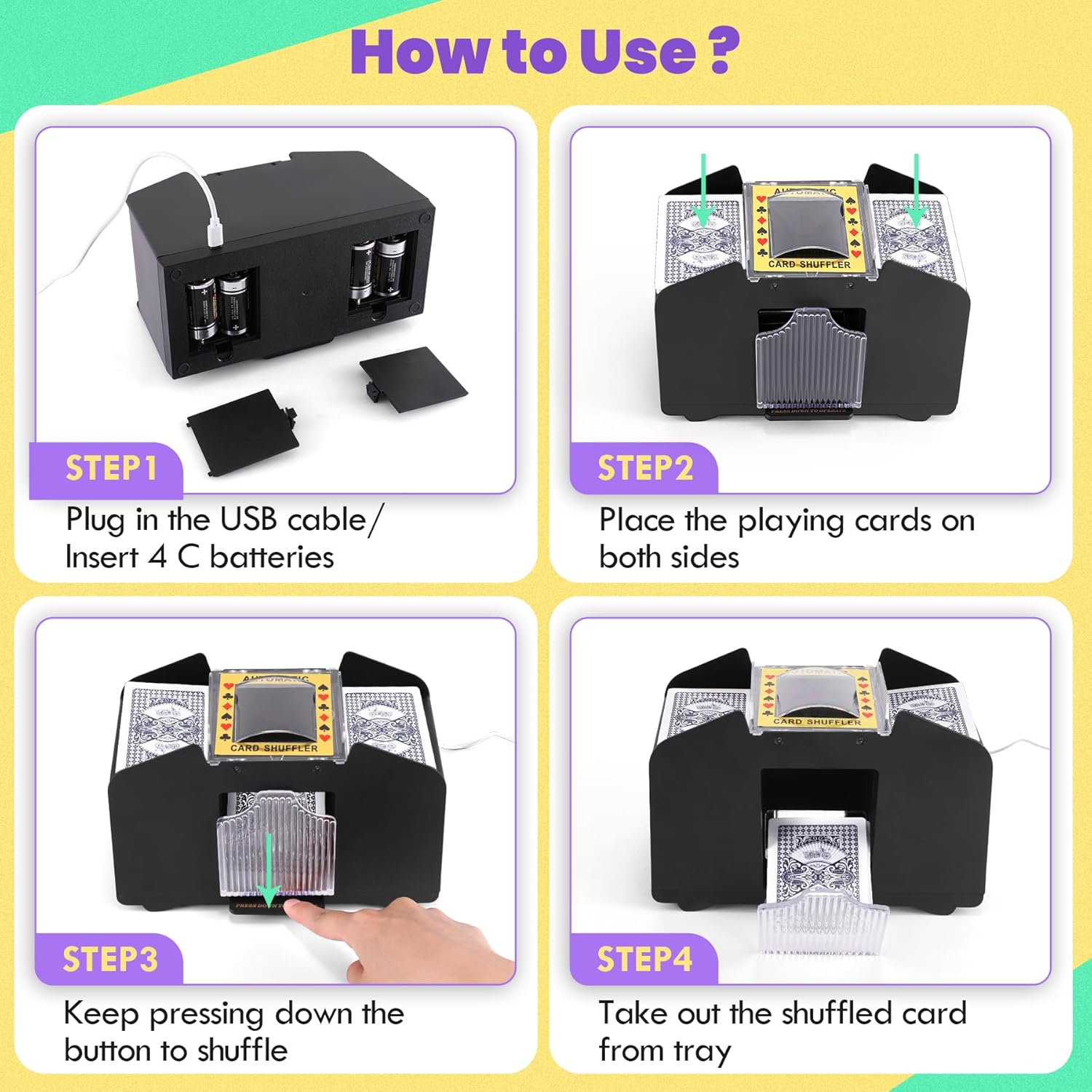 - USB-Power & Battery-Operated Card Shuffler: Lineba Automatic Card Shuffler has a USB-C interface: connect the shuffler's power cord (Power Cord Included) to any USB port that can provide a 5V power supply, and you can start using it immediately. The Card Shuffler also still includes the 4 C battery power method ( Batteries Not Included ), so you can flexibly choose which method to use according to your needs