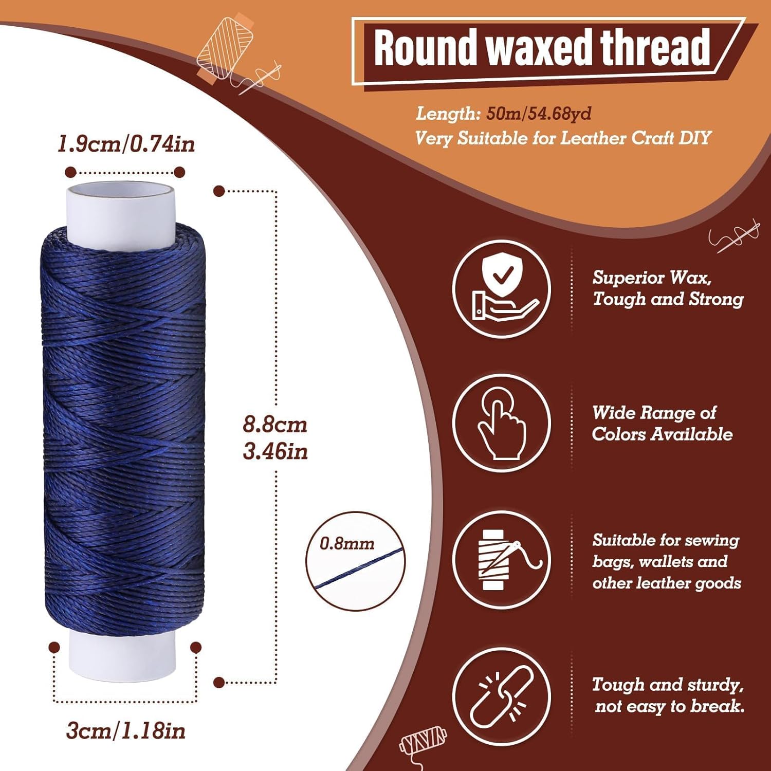 - Waxed Thread for Leather: 0.8 mm thick, 54 yards per spool, leather sewing thread made from braided polyester, the amount of wax on the cord is moderate and easy to handle, Multi-strand woven round waxed thread strong, wear-resistant, and waterproof, ideal for leather sewing, stitching, braiding, knotting, beading, binding, necklace and bracelet making