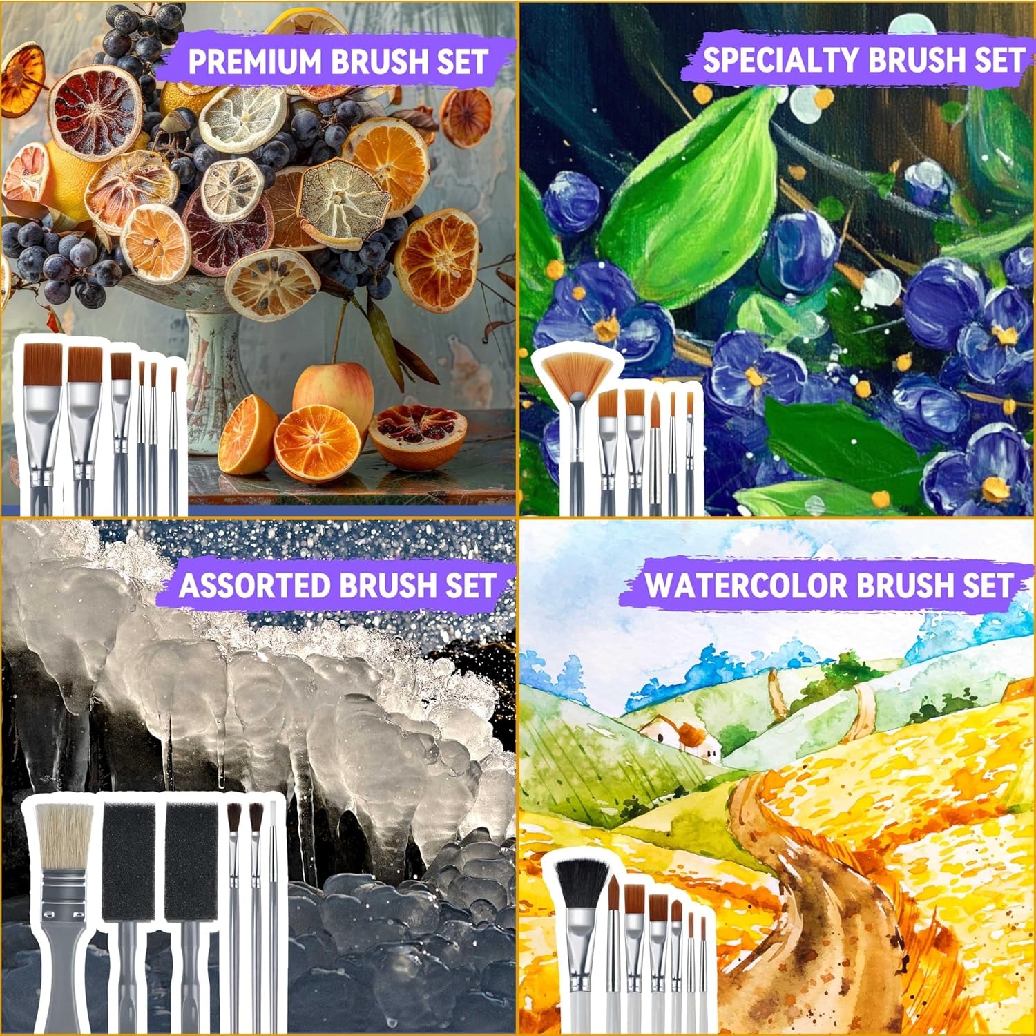 - [Comprehensive 26-Piece Brush Set]This brush set features five distinct collections tailored for various painting styles: the Specialty Brush Set, Premium Brush Set, Assorted Brush Set, Watercolor Brush Set, and Palette Knife. It includes flat, round, filbert, angled, fan, liner, and detail brushes, offering a comprehensive range of tools to meet every artist's needsβfrom intricate details to bold, expressive strokes.