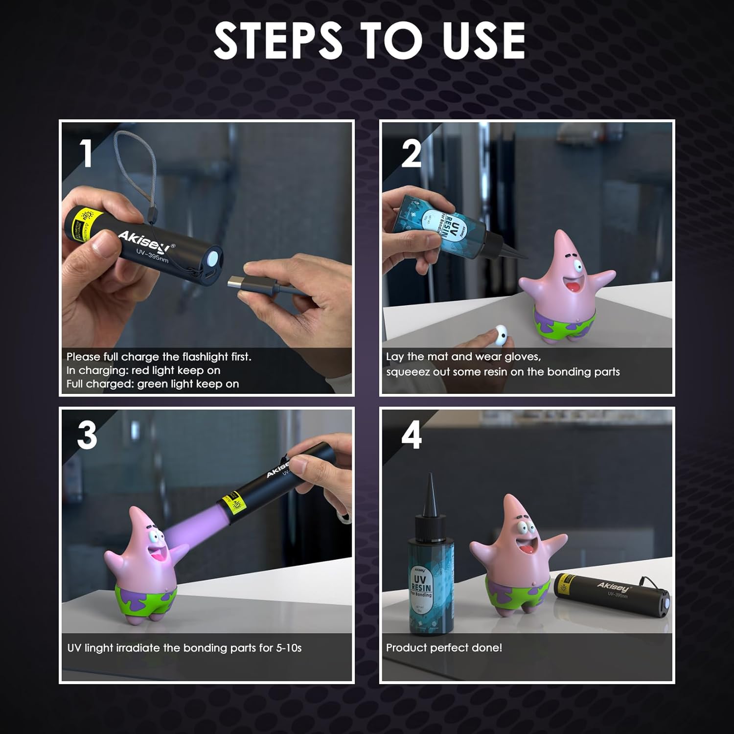 - 【UV Resin Kit With Light】 - Akisey UV resin for bonding has low viscosity and strong adhesive. Under the irradiation of 395nm UV flashlight, the UV resin can fast cured in just 5-10s. Meanwhile comes with 7.8x7.8in Silicone Mat, A pair protective gloves, A storage bag, what we offered is for your better bonding experience