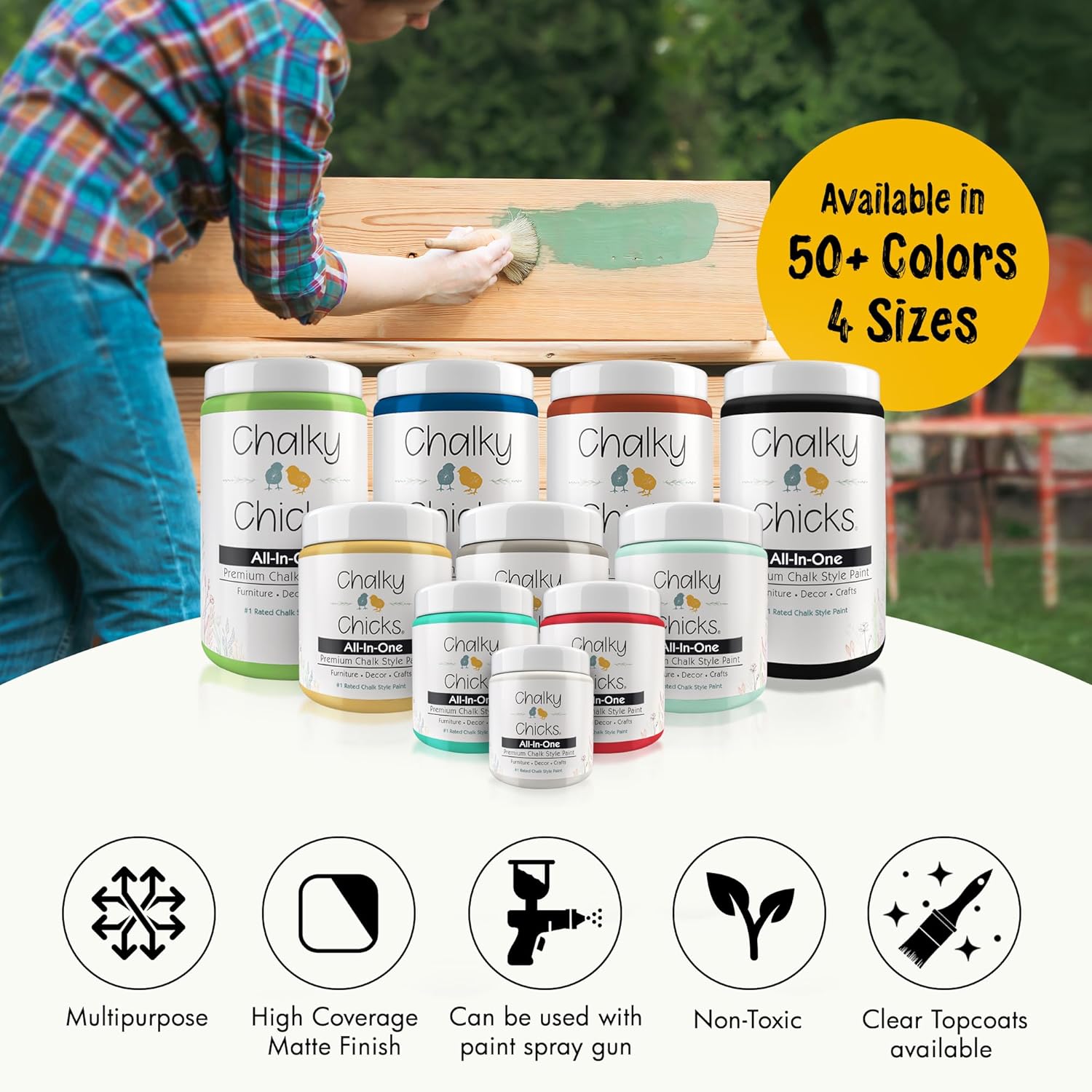 - TRANSFORM FURNITURE AND HOME DECOR WITH EASE: Chalky Chicks will save you time, money, and hassle. No sanding, priming, or multiple coats needed—just start painting your furniture with our cabinet paint no sanding or priming. Our paint is suitable for wood, metal, concrete, textiles, laminate, and more. Whether you prefer navy blue chalk paint, light blue paint, or green chalk paint, our chalk paint for furniture transforms any space with ease, making it ideal for DIY projects & craft painting.
