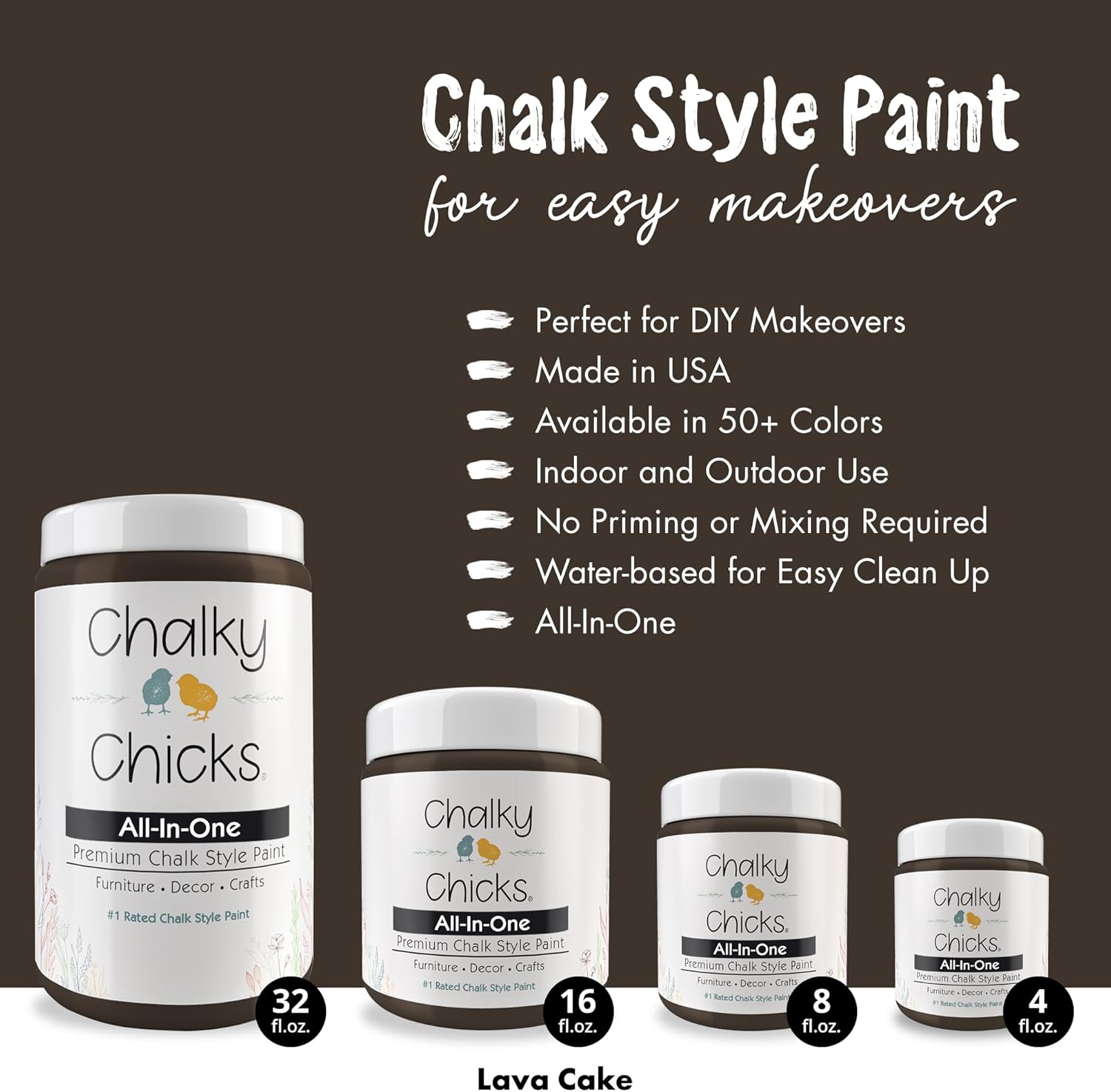 Chalky Chicks 8 Fl Oz Matte Lava Cake (Dark Brown) Chalk Paint for Furniture Without Sanding - No Prep Furniture Paint No Sanding All in One for Crafts, Wood,Walls, Cabinet, Metal, Dresser, Farmhouse