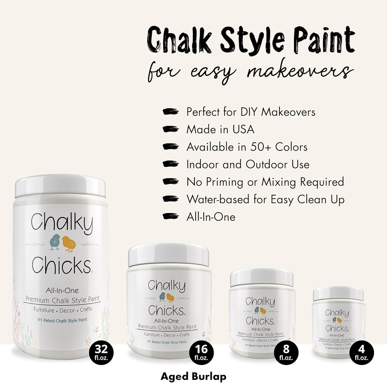 Chalky Chicks All-in-One Chalk Paint for Furniture or Cabinet - 8 Fl Oz - Matte Finish Aged Burlap White for Metal, Wood Furniture Paint - No Sanding All-in-One for Home Decor & Crafts, USA Made