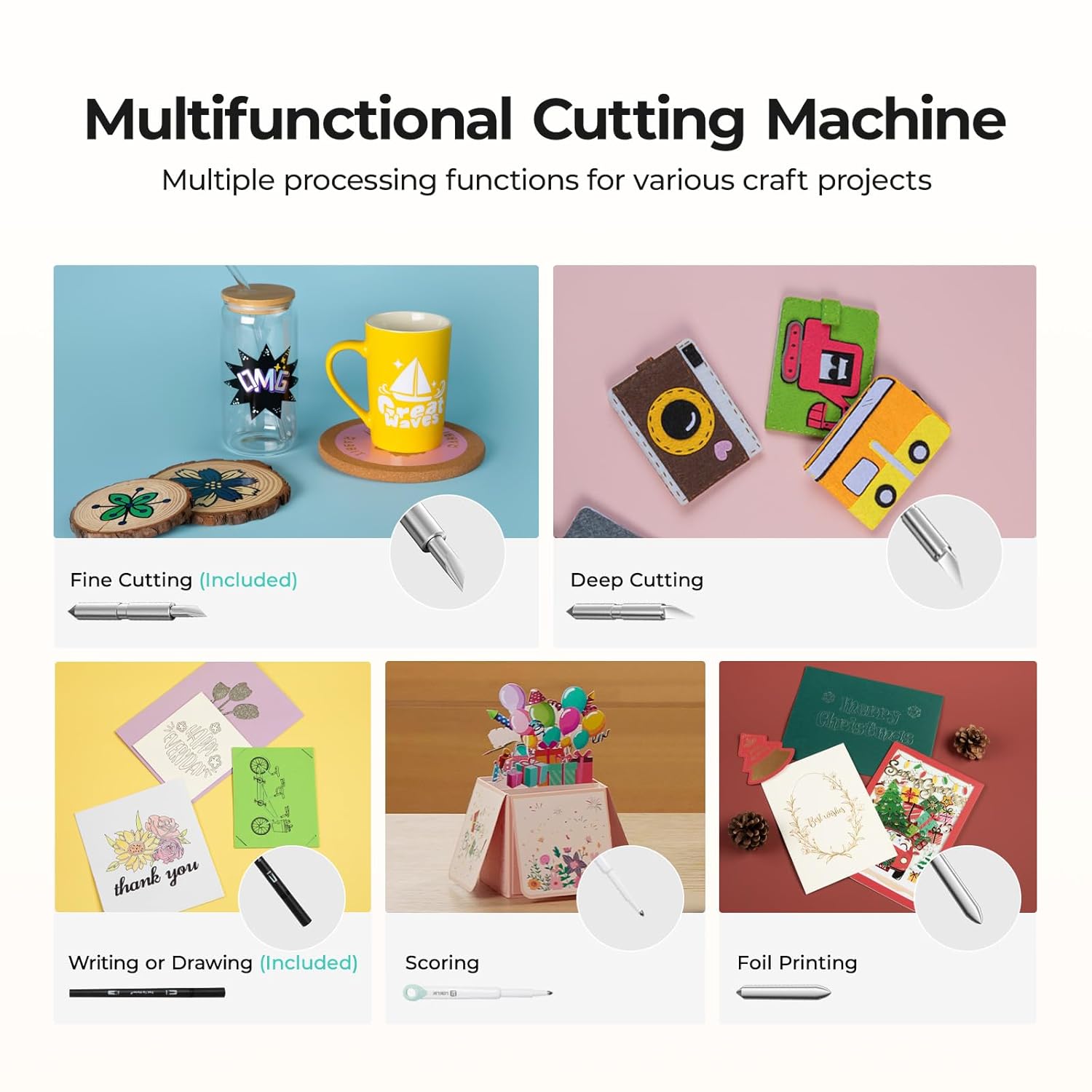 - 5 IN 1 MULTI-FUNCTION: Not only has fine-cutting, writing or drawing functions (tools included), this vinyl cutter machine also compatible with deep cutting, scoring and foil printing (tools sold separately). Whether youβre customizing t-shirts, making intricate cards, scrapbook pages, personalizing 3D boxes, or creating home decor, this machine can truly meet your craft needs and unlimited creativity