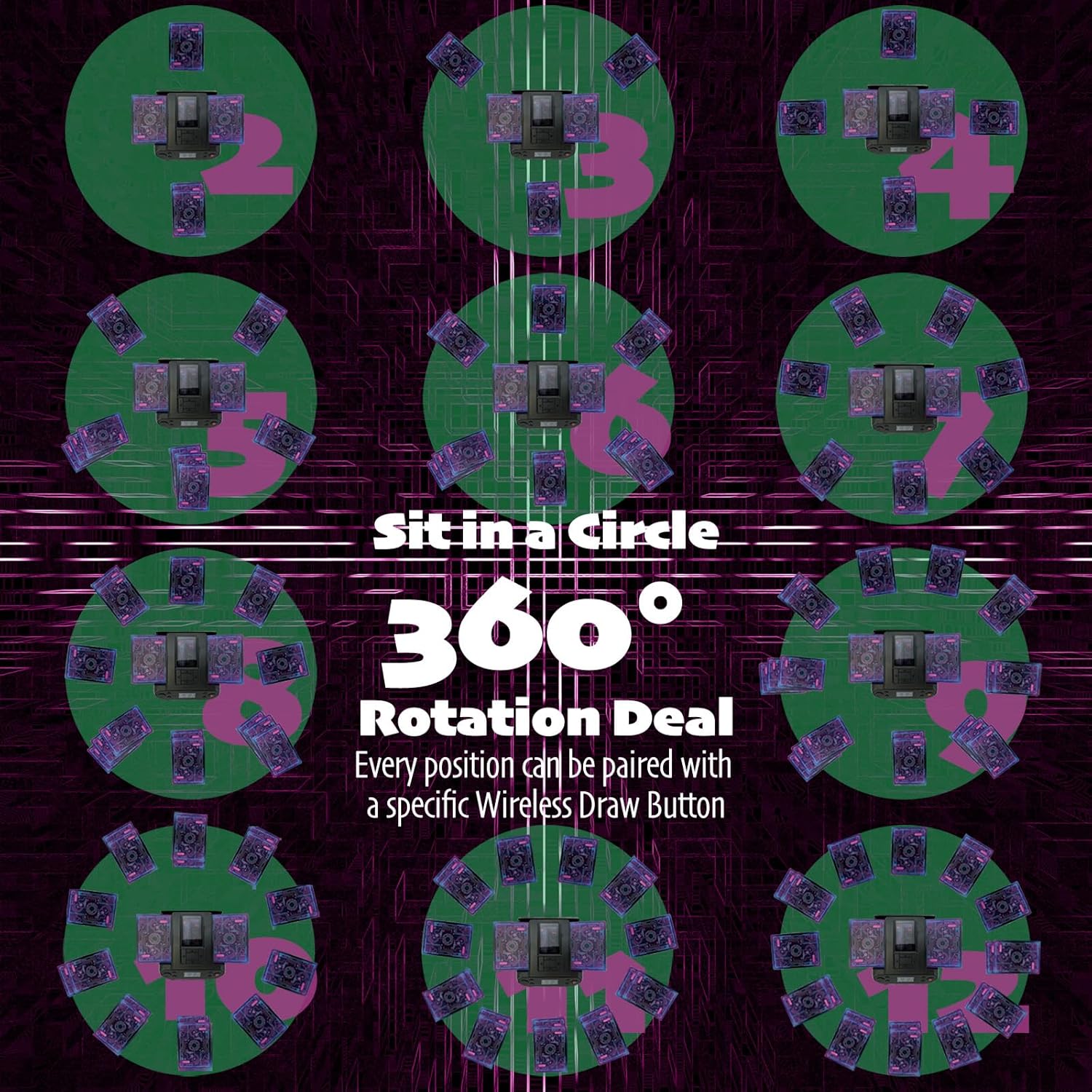 - 【Highly Customized Game and Easy Settings】: -Customizable Dealing Settings:Adjust the dealing distance to fit your game area; -Flexible Dealing Methods:Choose player positions in a full circle or on one side of the table;and explore a lot more options; -One-Click Card Draw;Easily draw cards using the machine’s built-in buttons or the Wireless Draw Buttons (4 included)