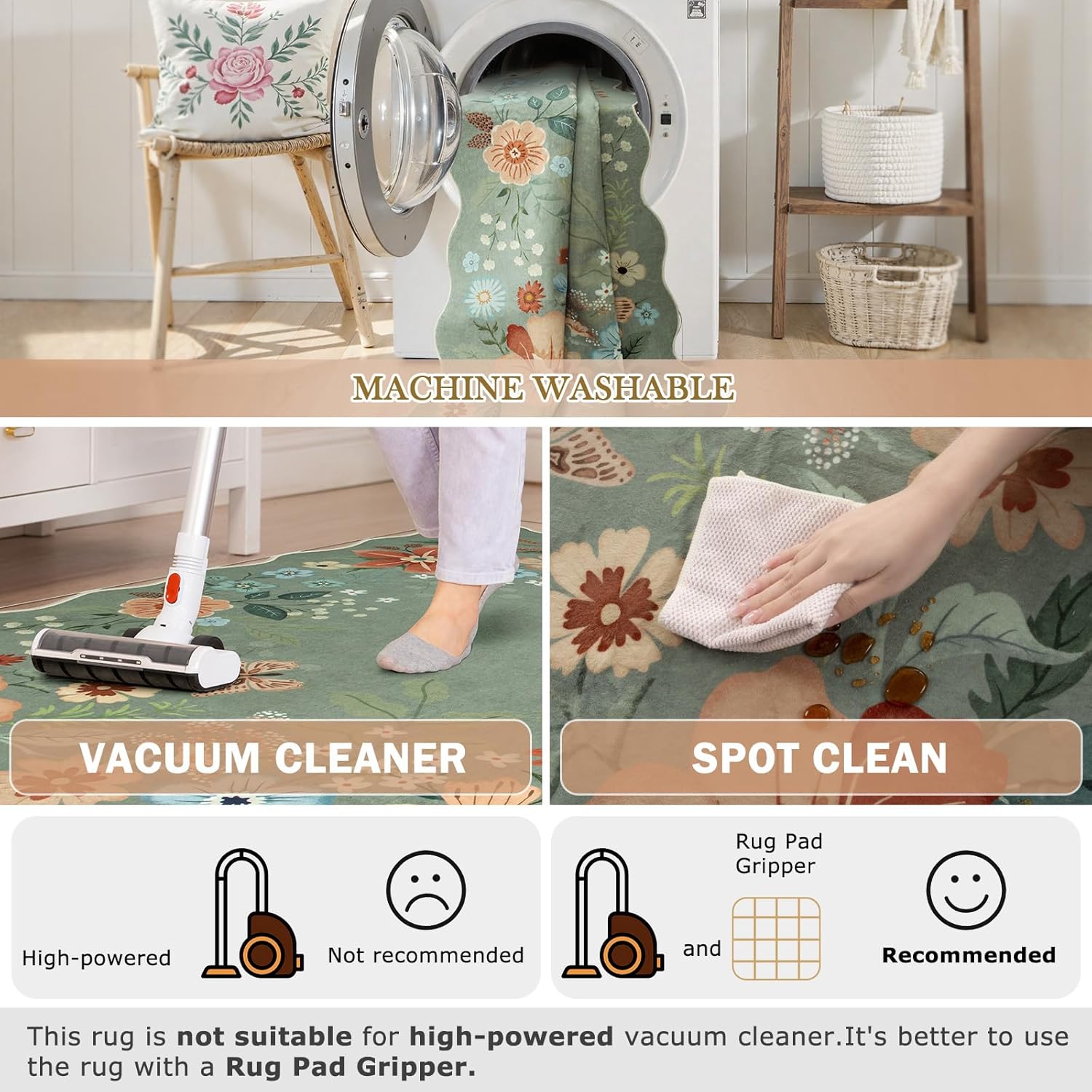 Beeiva Washable Rugs 5x7 - Scalloped Floral Printed Soft Non Slip Green Rug for Bedroom Under Bed Boho Living Room Rugs Ultra-Thin Low Pile Carpet for Playroom Dining Room Dorm(Green,5x7ft)