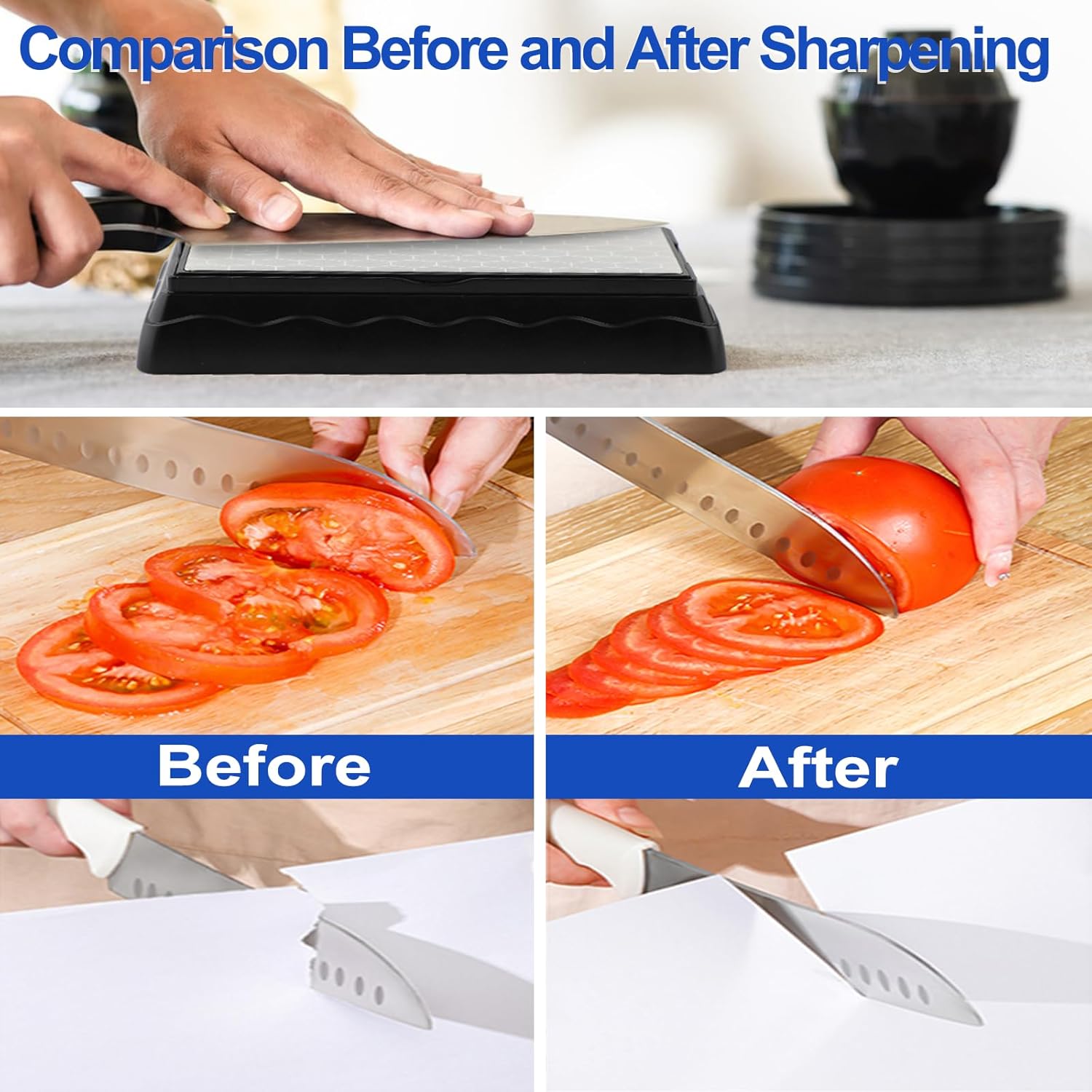 - Reliable Material:The double-side knife sharpening plate(1000/600 Grit) is made of diamond material, with honeycomb surface is safe and reliable, not easy to break or fade, with fine resistance to abrasion and corrosion.Due to the high hardness of the material and the low loss during use, our sharpening stone kit can be used for a long time.