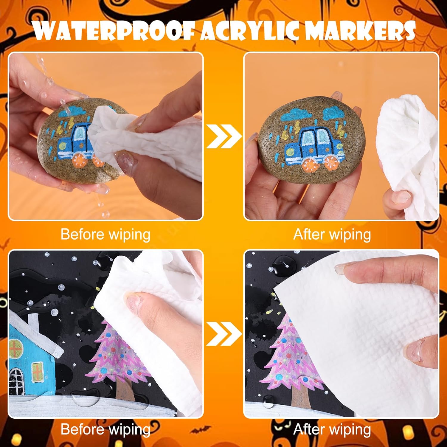 - Widely Used Painting Pens: Our dual-tip acrylic paint pens work on almost any surface, not only paper but also beautifully on rocks, wood, mugs, canvas, fabric, leather, ceramics, tiles, glass, resin, tires, balckboard, window, car, christmas ornament, jar labels, add decoration to graffiti, card making, bullet journal, pumpkin designs, easter eggs, and other smooth or porous surfaces. The The wide uses brings more creative possibilities to your art projects.