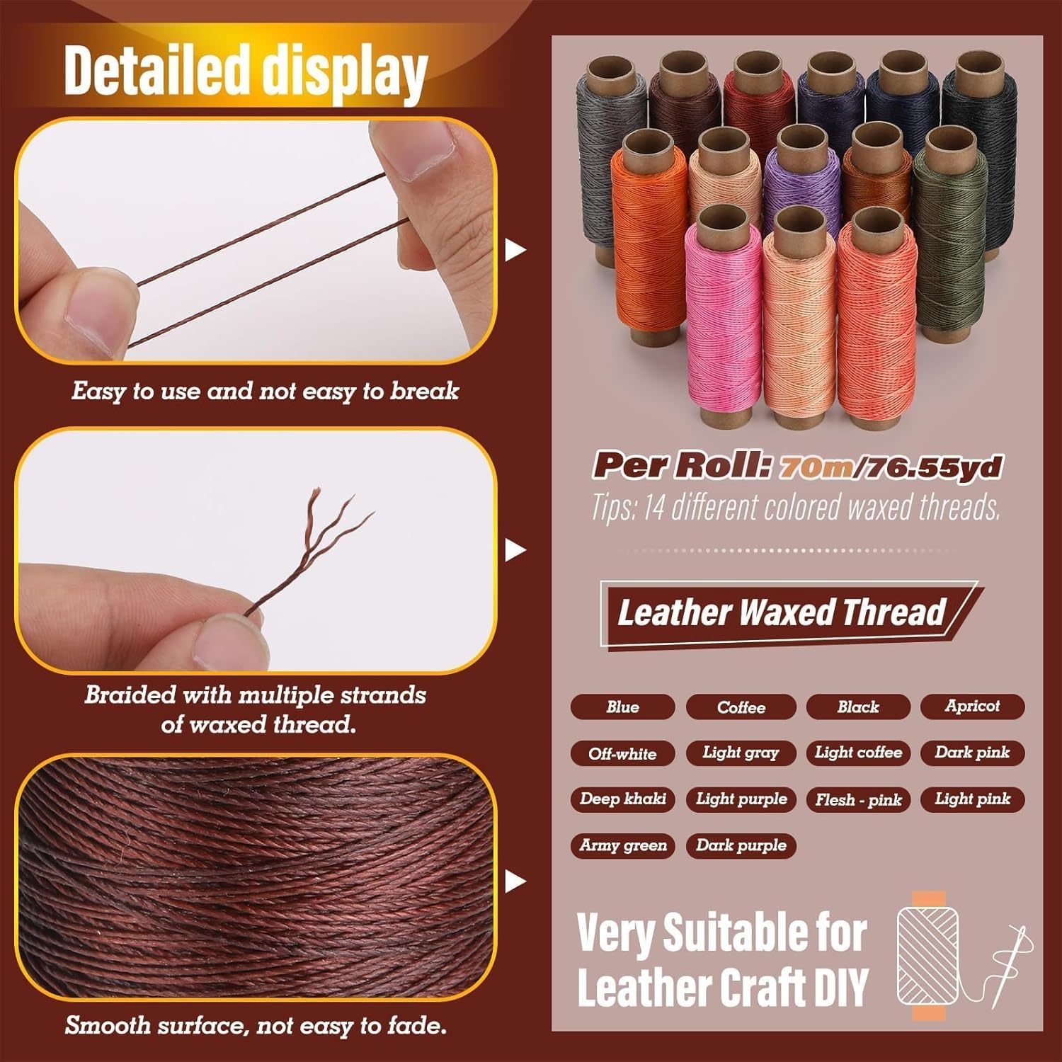 - Round Waxed Thread: Wax thread uses 3 strands of thread, make the thread stronger, waxed thread is not easy to unravel, preventing the stitches from coming loose and ensuring the longevity of the work, wax thread is evenly waxed, which can reduce friction during needle threading and sewing, and improve the smoothness of operation