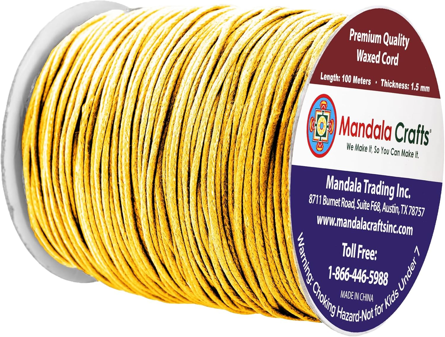 - Bulk Light Gold Waxed Cord Roll: The non elastic colorfast 1.5mm cotton cord with heat treatable ends is fraying resistant & bleed free. The continuous 3 ply 109 yds long 1.5mm jewelry waxed cord made from 100 percent cotton is easy to cut, tie, knot, or glue.