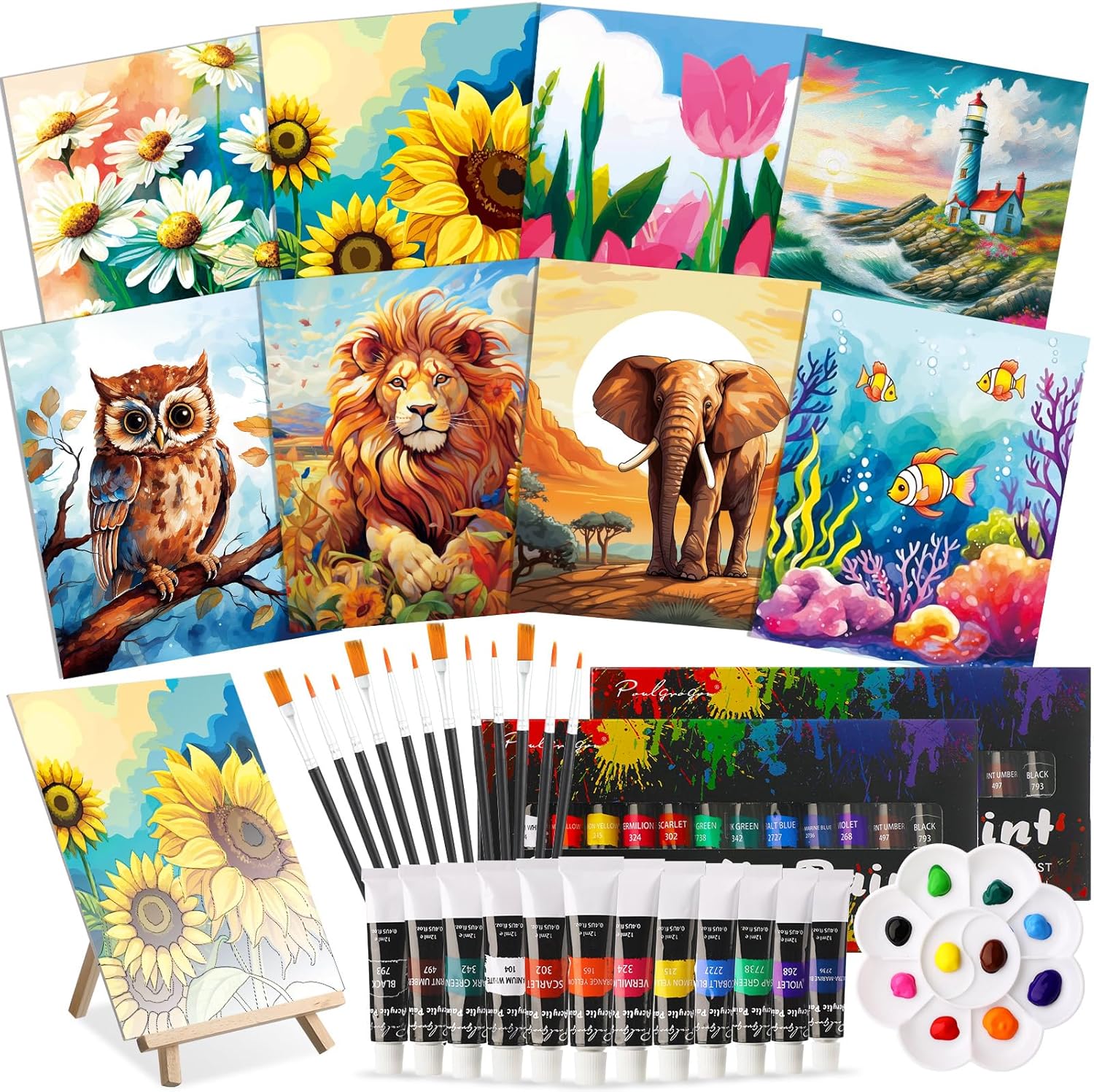 - Extensive Pre Printed Canvases Set: a total of 8 pre printed canvas, with 8 different well designed patterns; Comes with 12 reference color matching cards corresponding to the pattern; 2 packs of acrylic paint set, each pack contain 12 different colors; 2 pcs wooden easel holders; 8 packs of paintbrushes, 3 per pack, including 3 different pen and 8 pcs of white paint trays