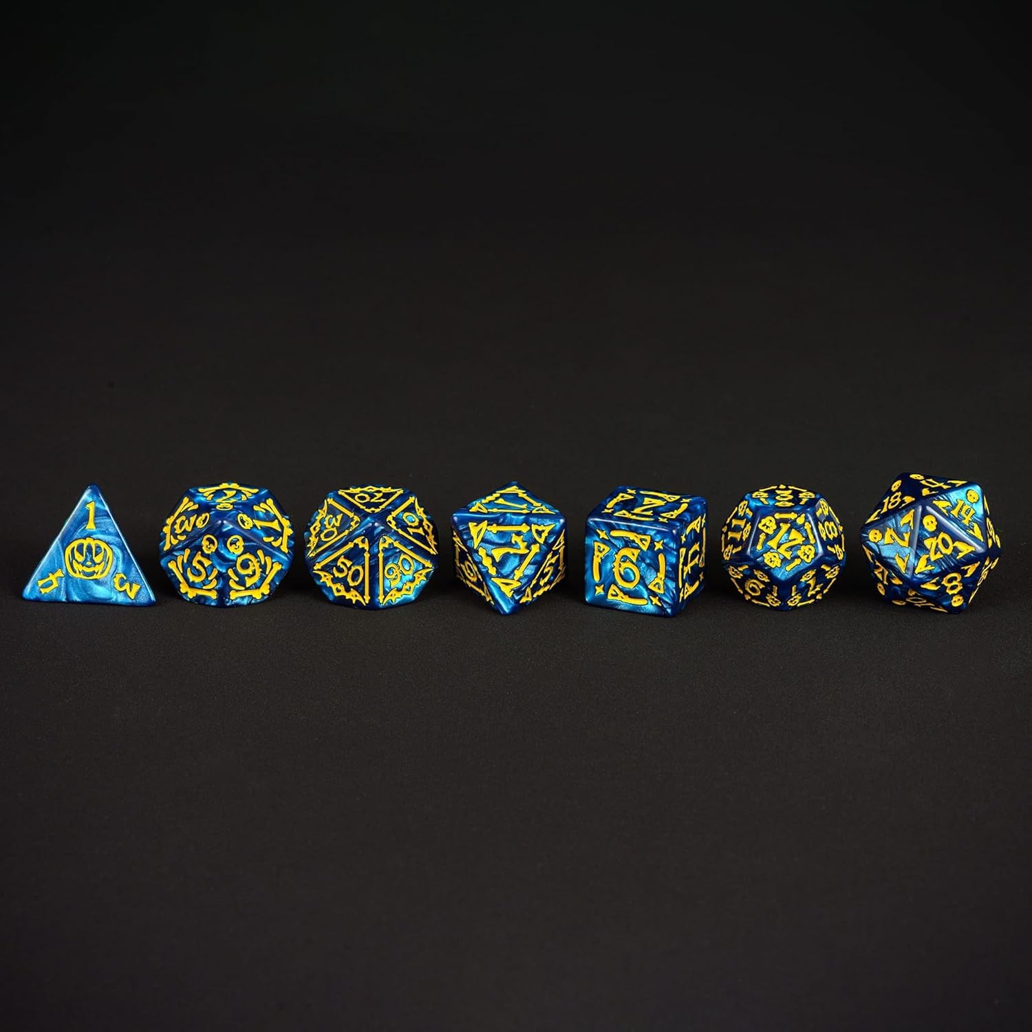 7-Die DND Dice Set Halloween Pattern Polyhedral Dice Set with Leather Bag, Skull Dice D&D Dice Set for RPG Table Games (Halloween Pattern-Blue)