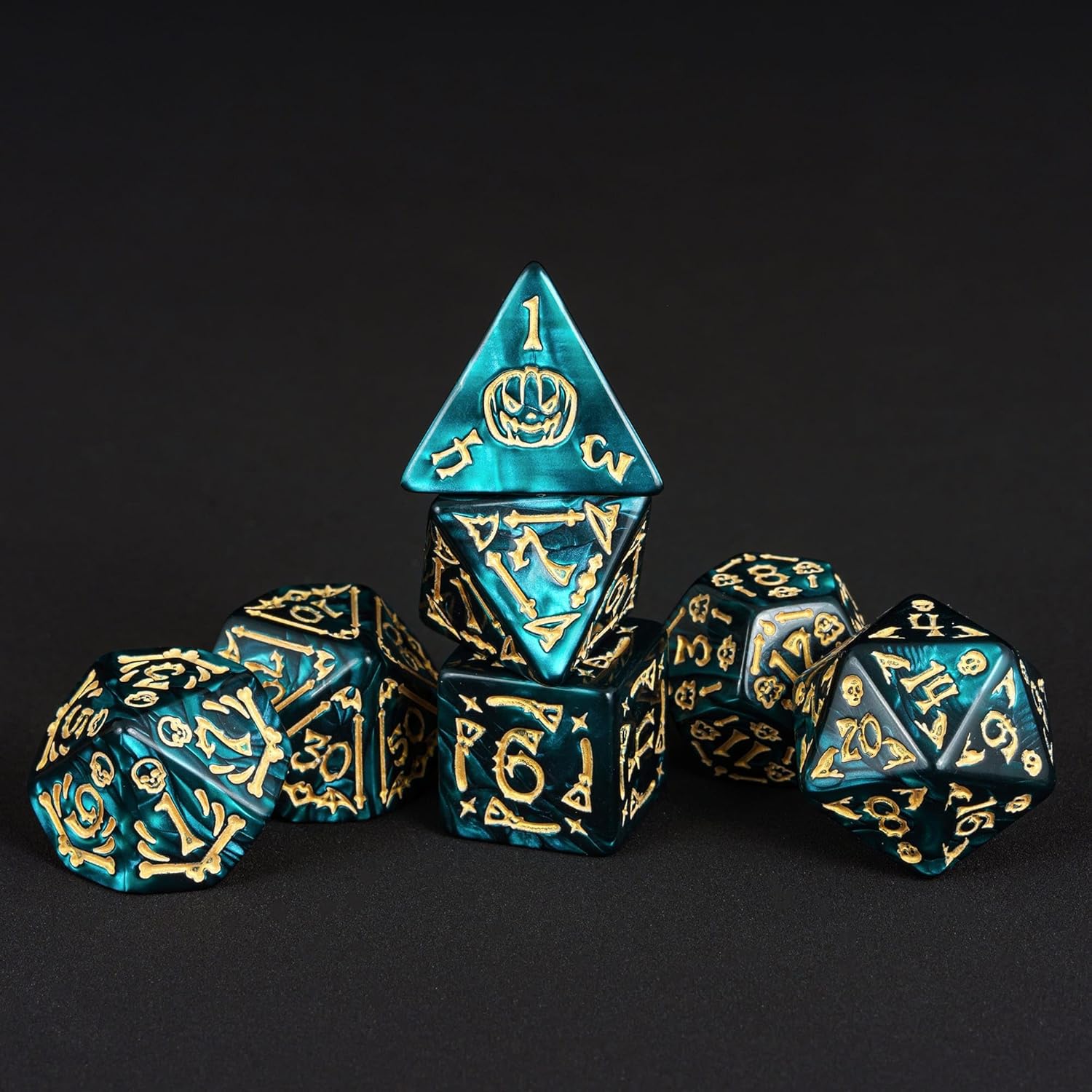 7-Die DND Dice Set Halloween Pattern Polyhedral Die Set with Leather Bag, Skull Dice D&D Die for RPG Table Games (Halloween Pattern-Green)