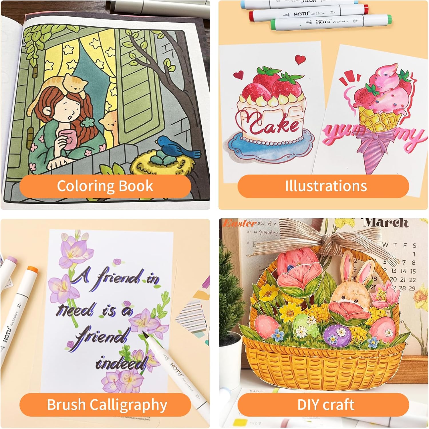 - THOUGHTFUL MULTI-ACCESSORY KIT: HOTU alcohol markers set delivers vibrant colors markers, plus a full kit for smooth, effortless mess-free coloring to easy start. 1 no-bleeding pad: use behind drawing pages to prevent ink from bleeding through; 4 pro artist-designed line art papers: color right after unboxing—enjoy smooth blending and creative relaxation; 1 color swatch: can see all hues at a glance to pick perfect shades fast