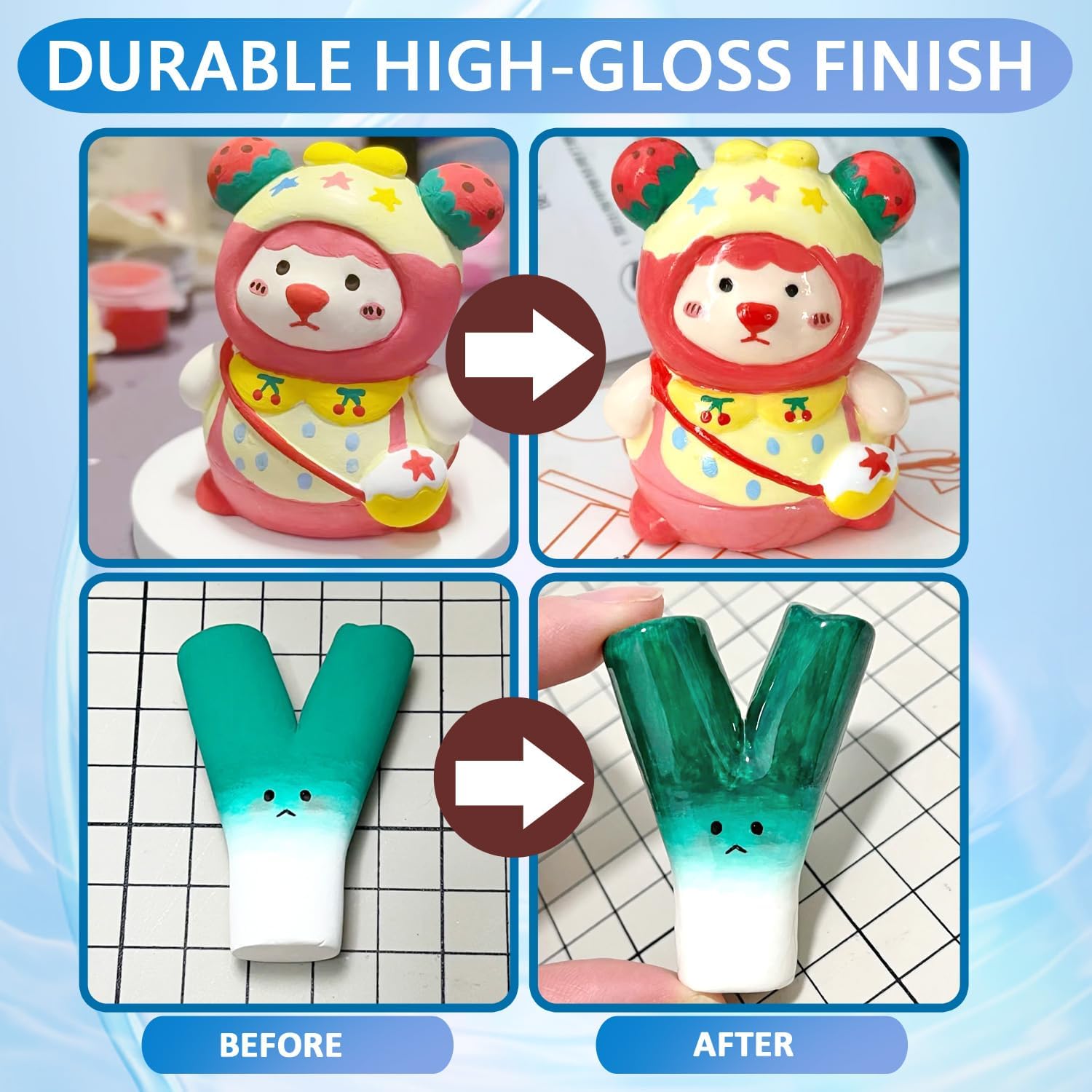 - Durable Protection: Our air dry clay glaze provides the clay work a scratch-resistant and waterproof coating for long-lasting protection. Use clay varnish for a professional-grade glossy effect, making the artwork look more attractive. Gloss varnish forms a crystal clear and solid protective film after drying, effectively preventing the work from yellowing.