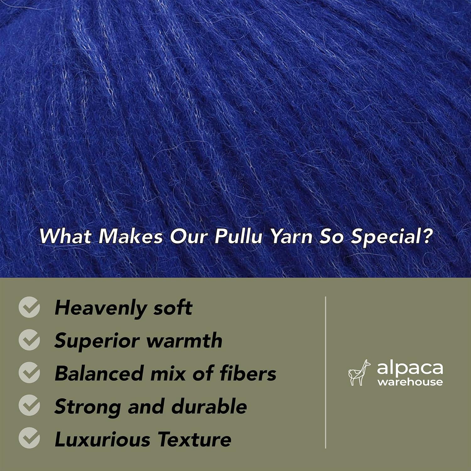 - Baby Alpaca and Merino Wool blend: Sourced directly from a manufacturer in Peru, each skein of yarn is custom-made for Alpaca Warehouse! As a result, we’re able to offer a premium wool that’s beautifully unique, surprisingly strong, and even hypoallergenic. Our yarn composition is 70% Baby Alpaca, 7% Merino Wool (21.5 mic.), 23% Polyamide.