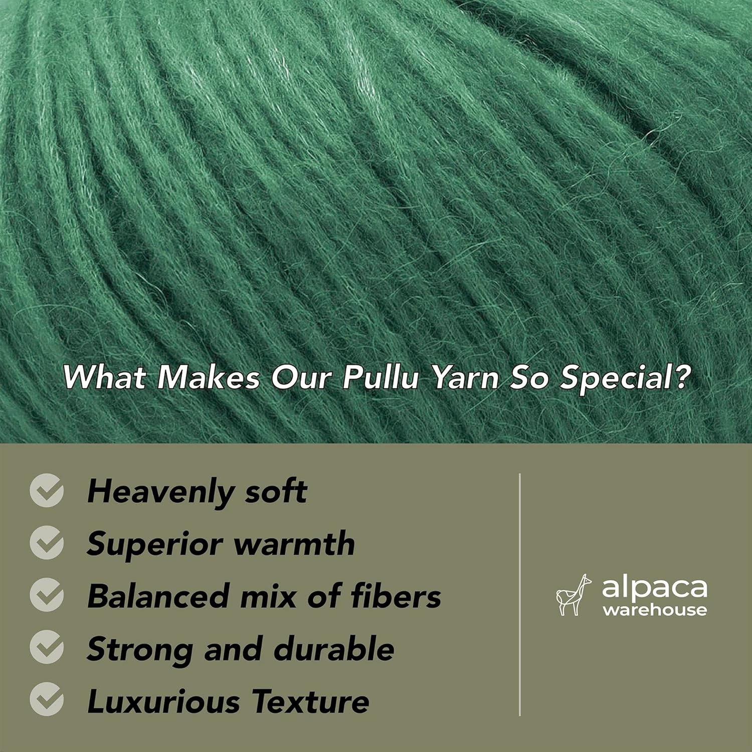 - Baby Alpaca and Merino Wool blend: Sourced directly from a manufacturer in Peru, each skein of yarn is custom-made for Alpaca Warehouse! As a result, we’re able to offer a premium wool that’s beautifully unique, surprisingly strong, and even hypoallergenic. Our yarn composition is 70% Baby Alpaca, 7% Merino Wool (21.5 mic.), 23% Polyamide.