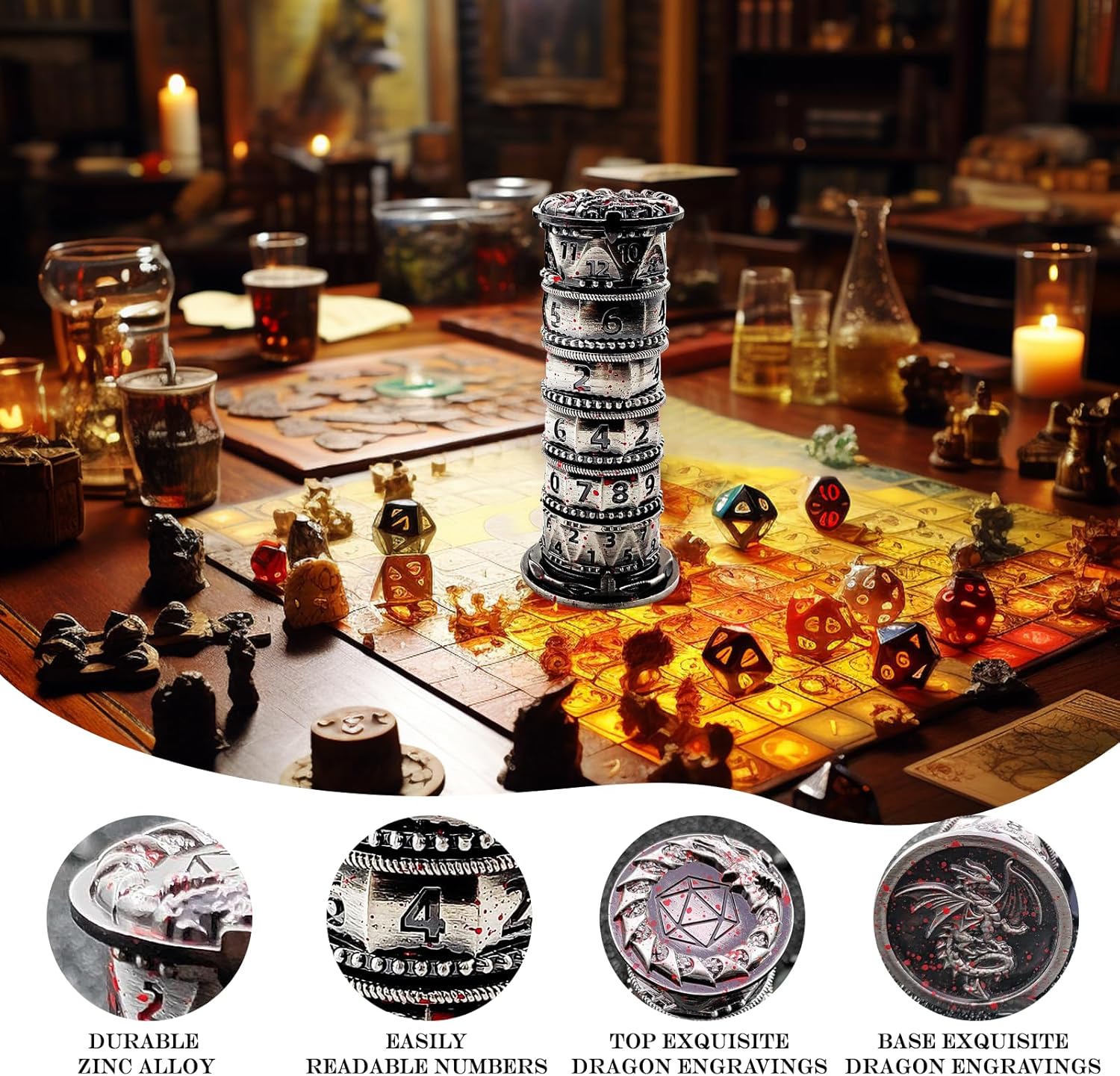 DND Dice Spinner Tower Set - Unique D4 D6 D8 D10 D10% D12 D20 All in One D&D Metal Dice - Cool Role Playing Gifts for Dungeons and Dragons TRPG MTG Games Lover Players (Tower-Bloodstained)