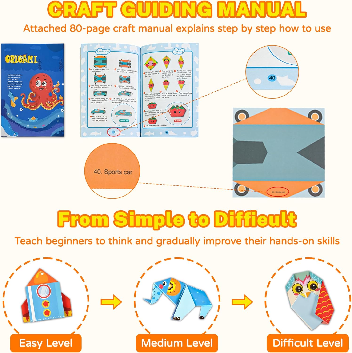 Craft Origami Paper for Kids,204 Sheets Colorful Folding Paper with 72 Patterns and Guiding Book Art Projects Kit for 5-12 Years Old Girl Boy Teen Birthday Christmas Present Preschool Educationa