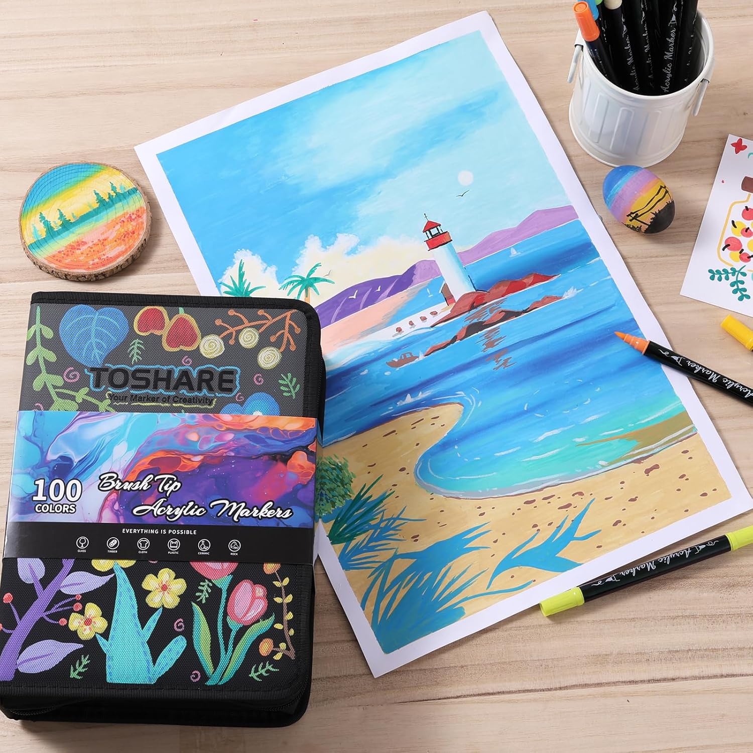 TOSAHRE Acrylic Paint Pens Markers 100 Colors Waterproof Dual Tip Acrylic Markers Set with Brush & Fine Tip Coloring Pens for Rock Painting Wood Scrapbook Fabric Glass Ceramic DIY Craft Art Supplies