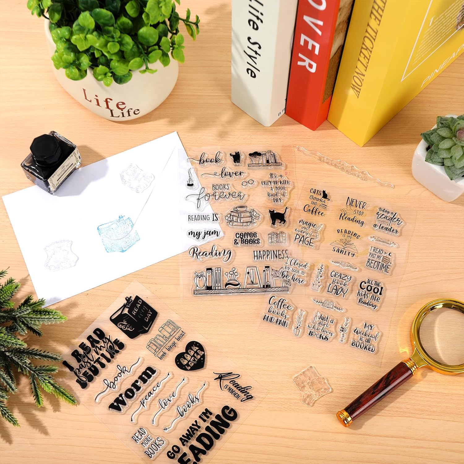 Whaline 4 Sheets Reading Words Clear Stamps Greeting Words Bookcase Bookshelf Silicone Transparent Stamps for DIY Craft Card Making Scrapbooking Embossing Album Decor