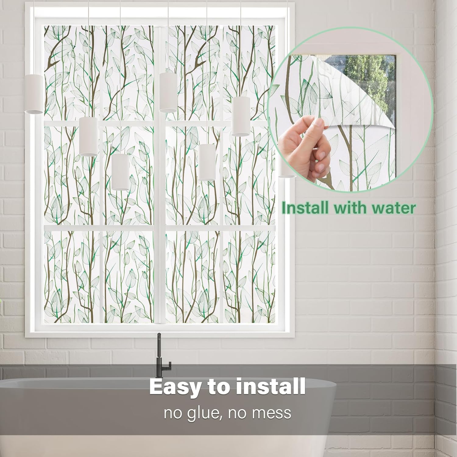 Donox Frosted Glass Window Film Heat Control UV Blocking, Static Cling Reusable Home Bathroom Door Window Privacy Film, Green Leaf Pattern Window Covering with Installation Tool, 23.6 in x 6.5 feet