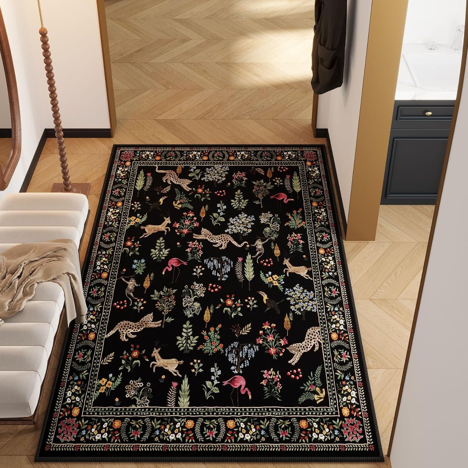 Rugcomf Bedroom Rug 3x5 Rug Washable Area Rug Non Slip Low Pile Boho Floral Animal Small Carpet for Bedroom, Bedside, Kitchen, Entryway, Kids Room, Office, College Dorm Essentials for Girls (Black)