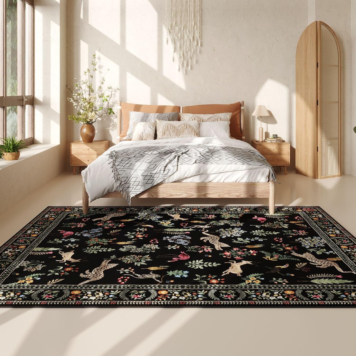 Rugcomf Living Room Rug 5x7 Rug Machine Washable Boho Area Rug Non Slip Floral Animal Vintage Low Pile Large Rugs for Living Room, Bedroom, Farmhouse, Dining Room, Kids Playroom (Black)