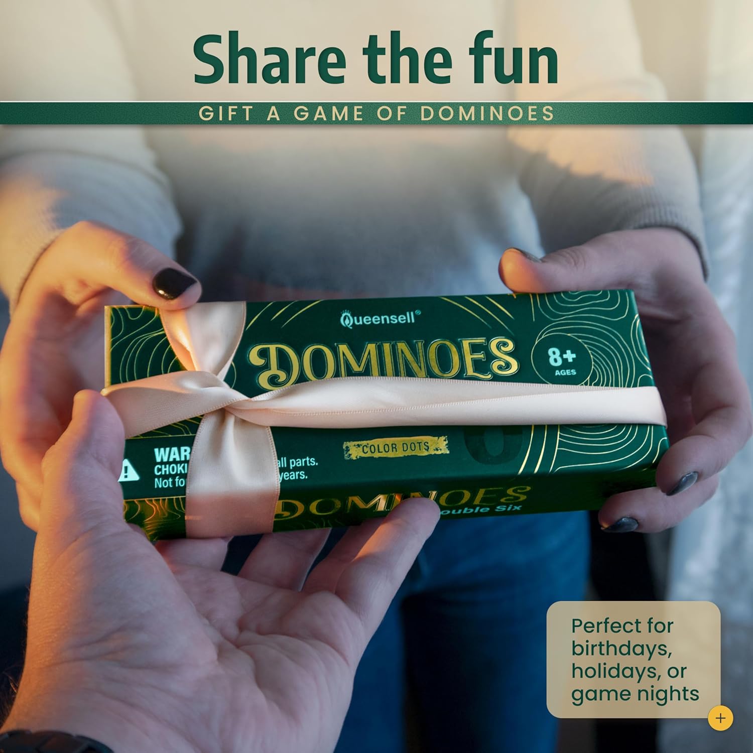 Queensell Dominos Set for Adults with Colored Dots - Double 6 Dominoes Set is a Classic Board Games for Kids and Adults - Double Six Standard Dominos Set 28 Tiles