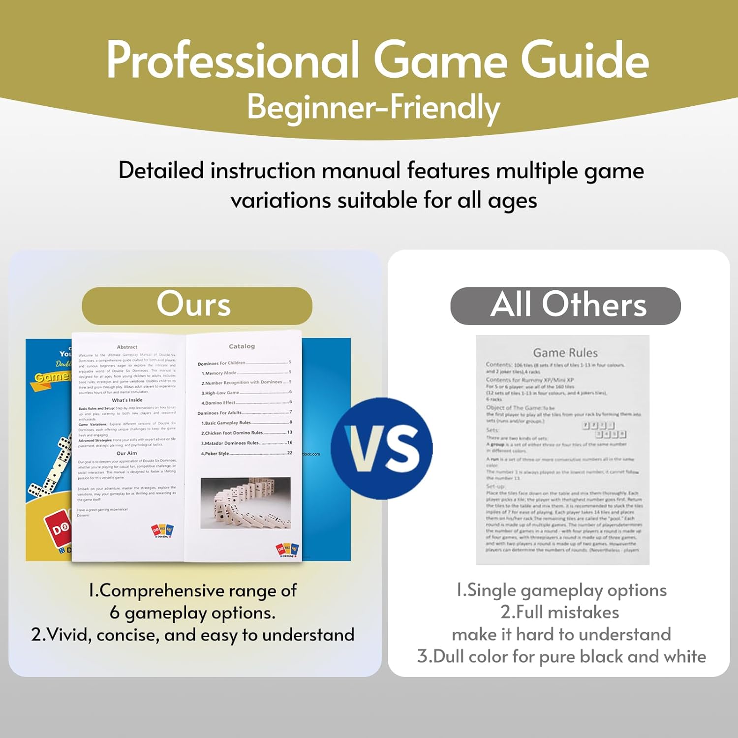 - Beginner-Friendly: Our Dominos Set for Adults comes with a well-designed manual, making it easy for newcomers to learn while offering advanced strategies for experienced players