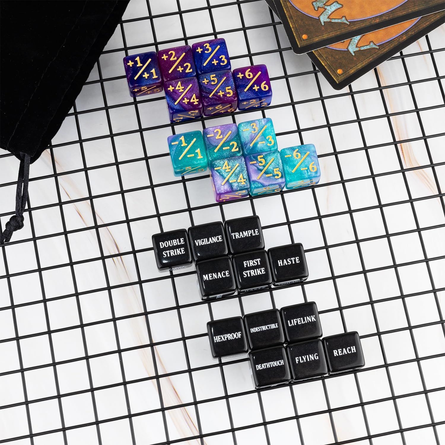 - Package Include: Total 24pcs black MTG keywords dice(FIRST STRIKE,DOUBLE STRIKE VIGILANCE,MENACE,TRAMPLE,HASTE / LIFELINK,REACH,FLYING,HEXPROOF,DEATHTOUCH,INDESTRUCTIBLE) and 24pcs dice counters(12 pieces blue -1~-6 counters & 12 pieces purple +1~+6 counters) with velvet pouch.