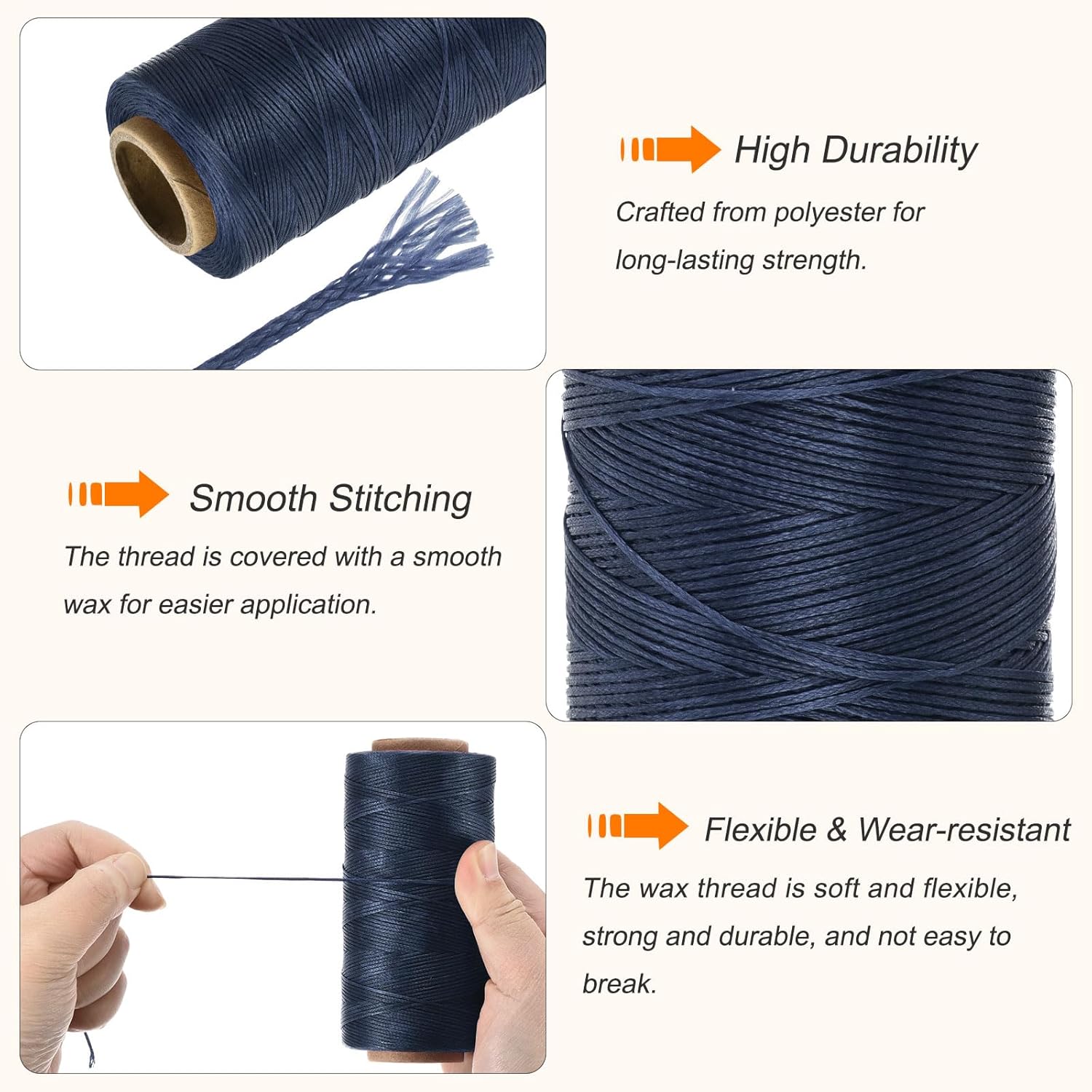 - 150D flat waxed thread is made of multiple polyester threads braided and covered with wax, which is tough and durable, not easy to break, and has high tensile strength; The waxed cord is soft and not easy to deform. The perforated sewing is smooth and flexible. It can withstand high temperatures and is easy to seal, cut, knot, and sew; it can be used for most leather DIY projects; Rich in colors, made of braided polyester, the thread is lightly waxed and coated, waterproof and non-fad