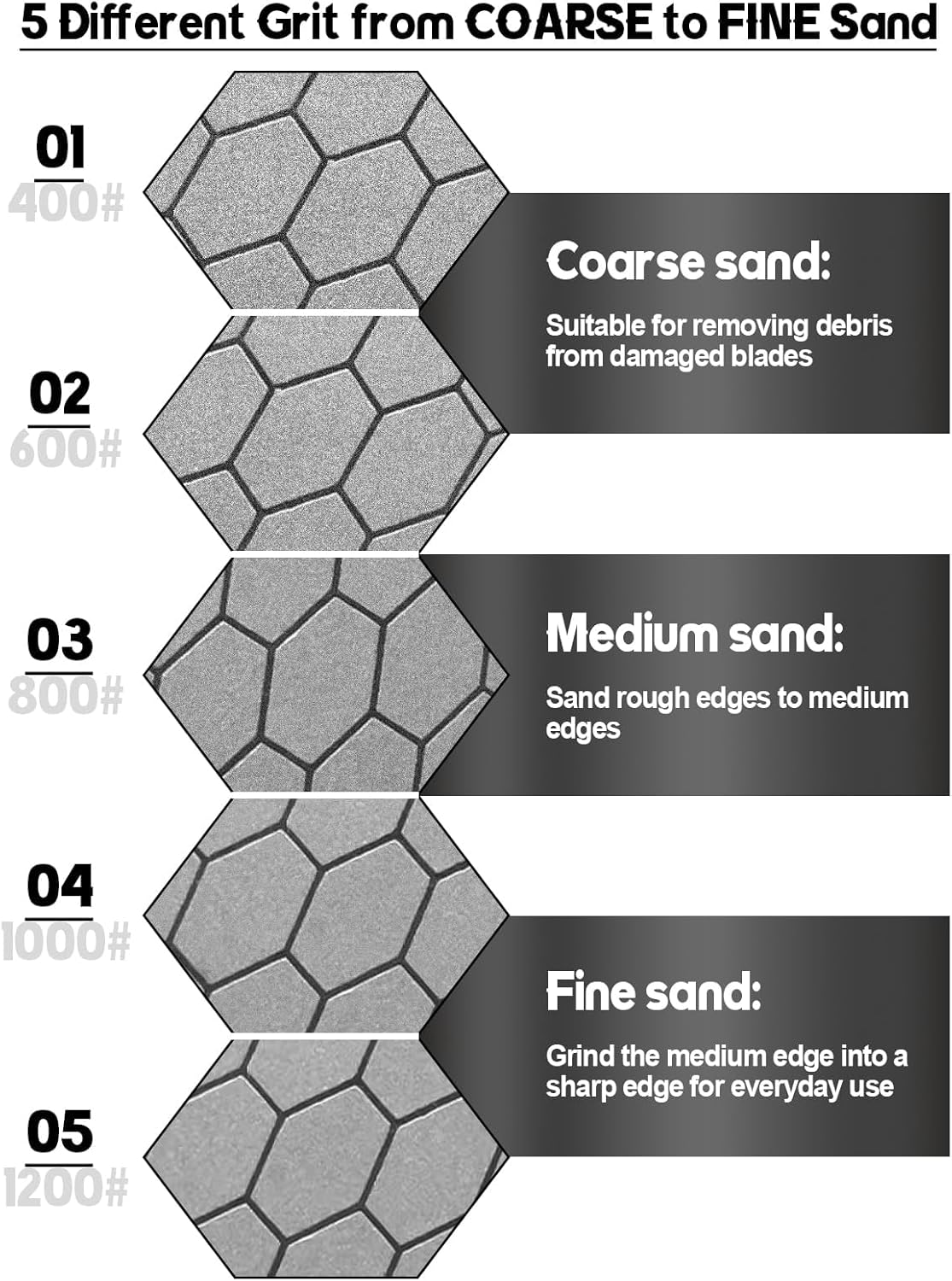 - Honeycomb Design: The unique honeycomb design ensures that the dust generated during the grinding process will not affect the sharpening. The diamond sharpening stone has a non-slip silicone base to ensure that it will not slip during use, and it is very lightweight to carry it. You can put it wherever you need to use easily and conveniently.