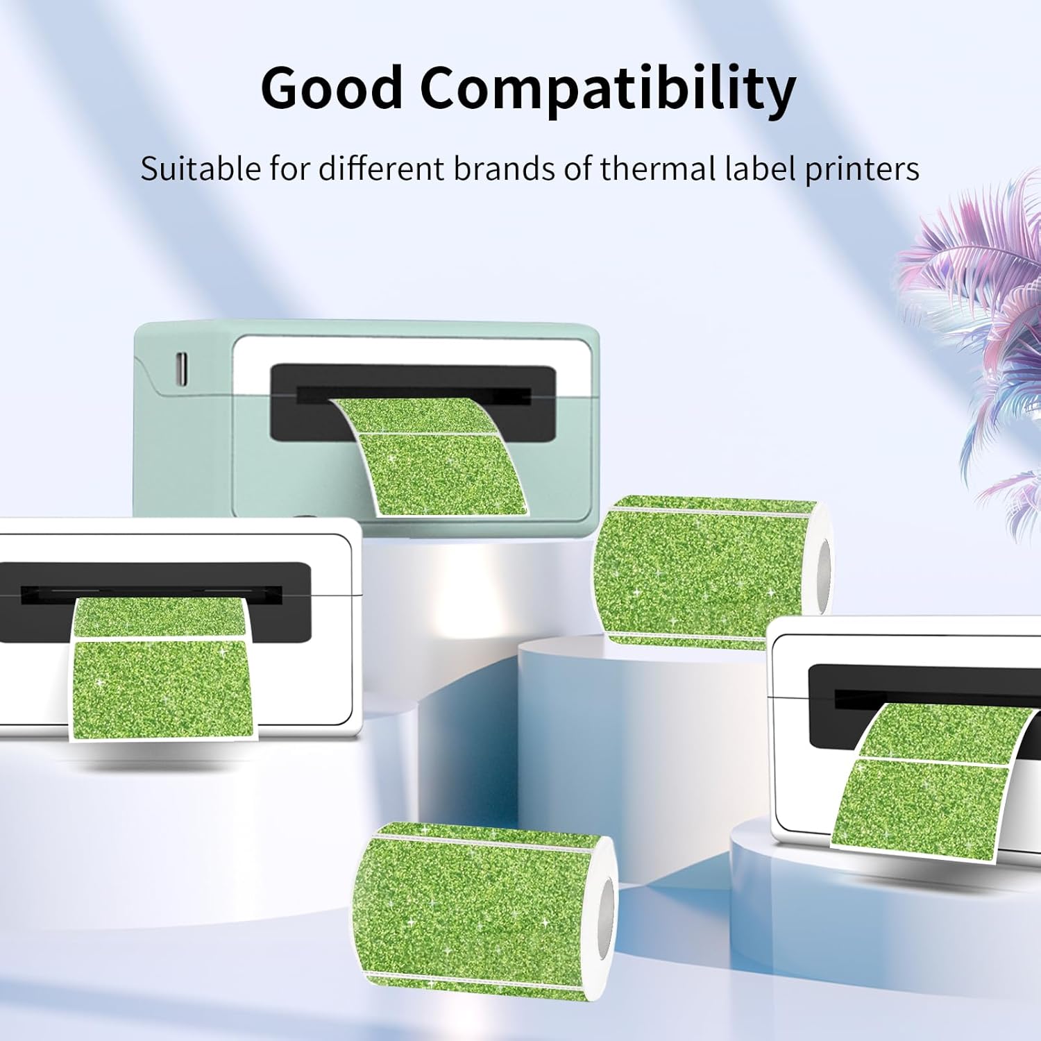 3x2 Inch Holographic Thermal Labels Stickers, Glitter Waterproof Direct Thermal Sticker Labels for Barcode, Mailing, DIY Design- 200Pcs /Glitter Green