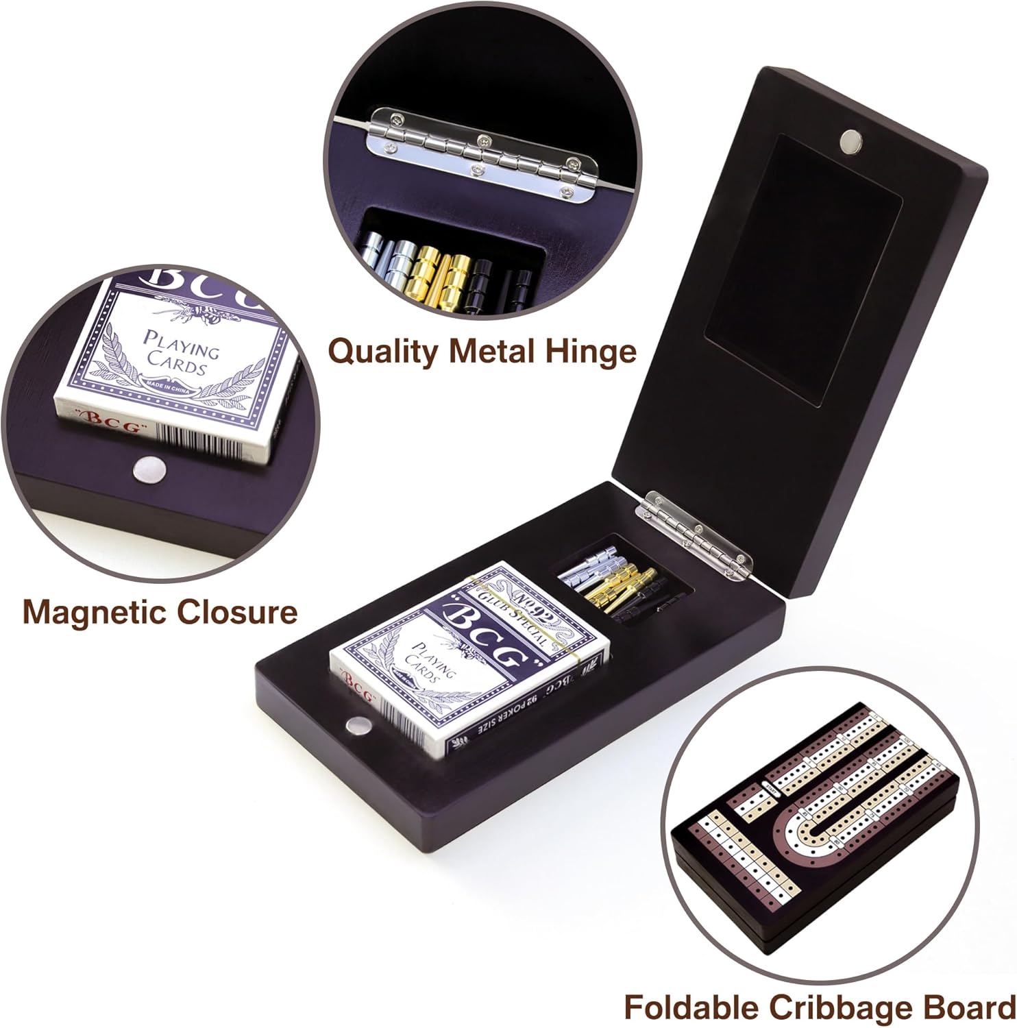 Cribbage Board Game Set - Wooden Foldable 3-Track Board with Magnetic Closure, 9 Metal Pegs, Playing Cards, Portable Family Travel Game for Gatherings and Gifts